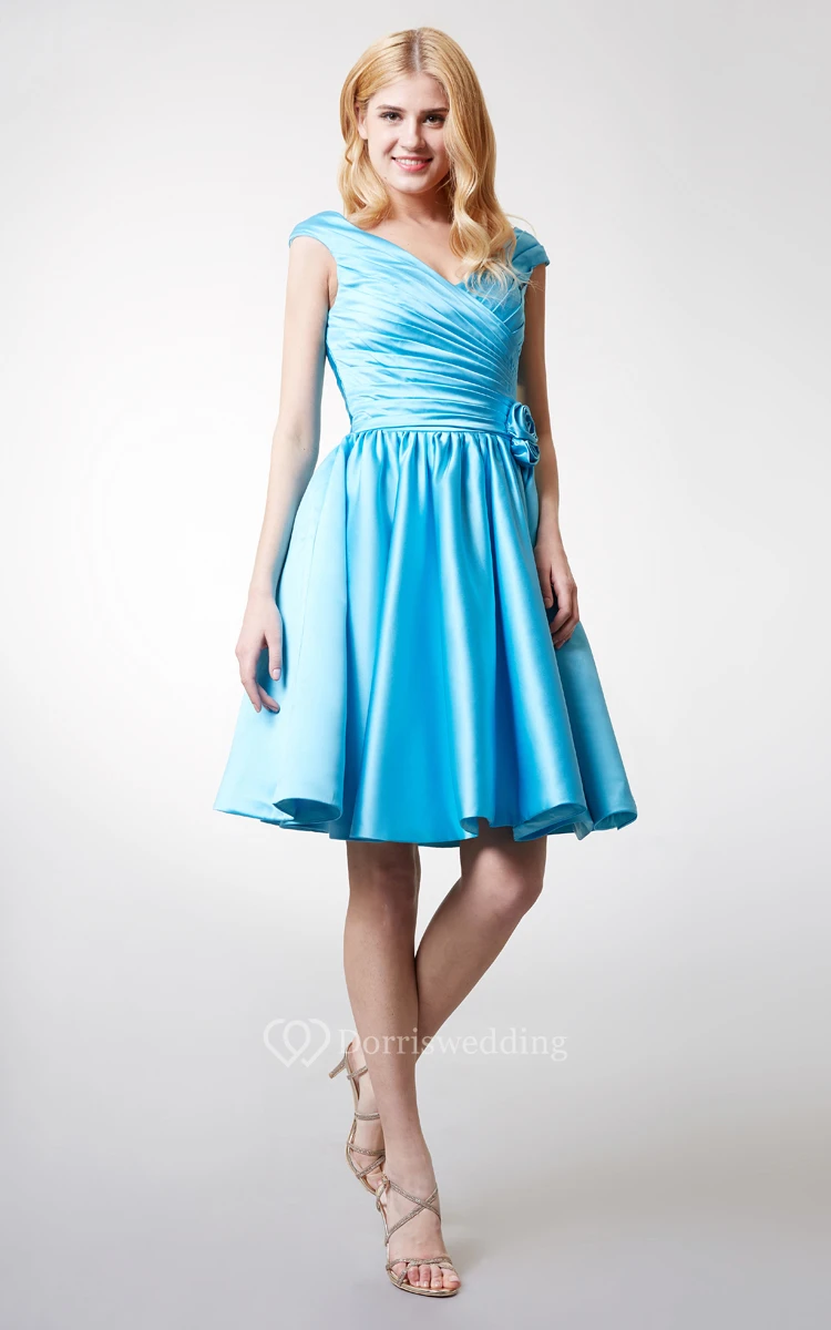 Feminine Off the Shoulder Ruched Short Satin Dress With Flowers