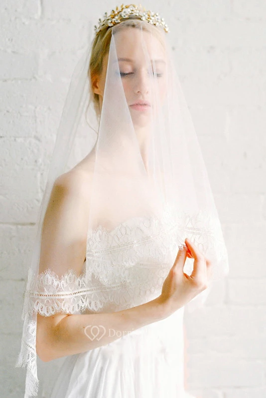 Fingertip Tulle Wedding Veil with Lace Trim