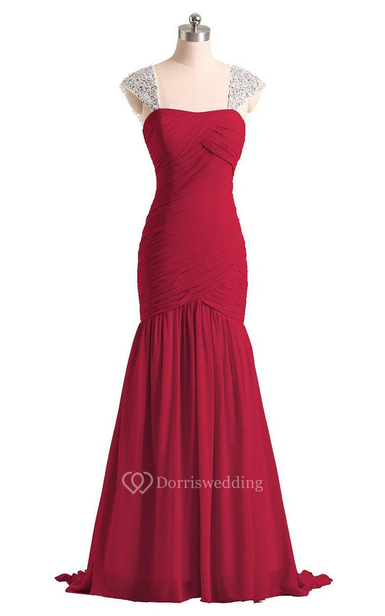 Fit and Flare Long Chiffon Dress With Crystaled Straps