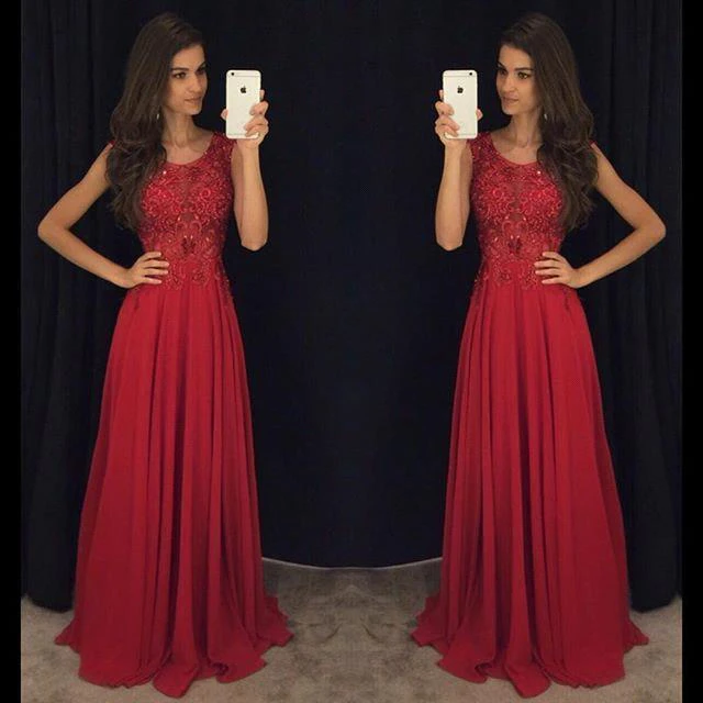Fit and Flare Sleeveless Red Evening Dresses Lace Appliques Chiffon