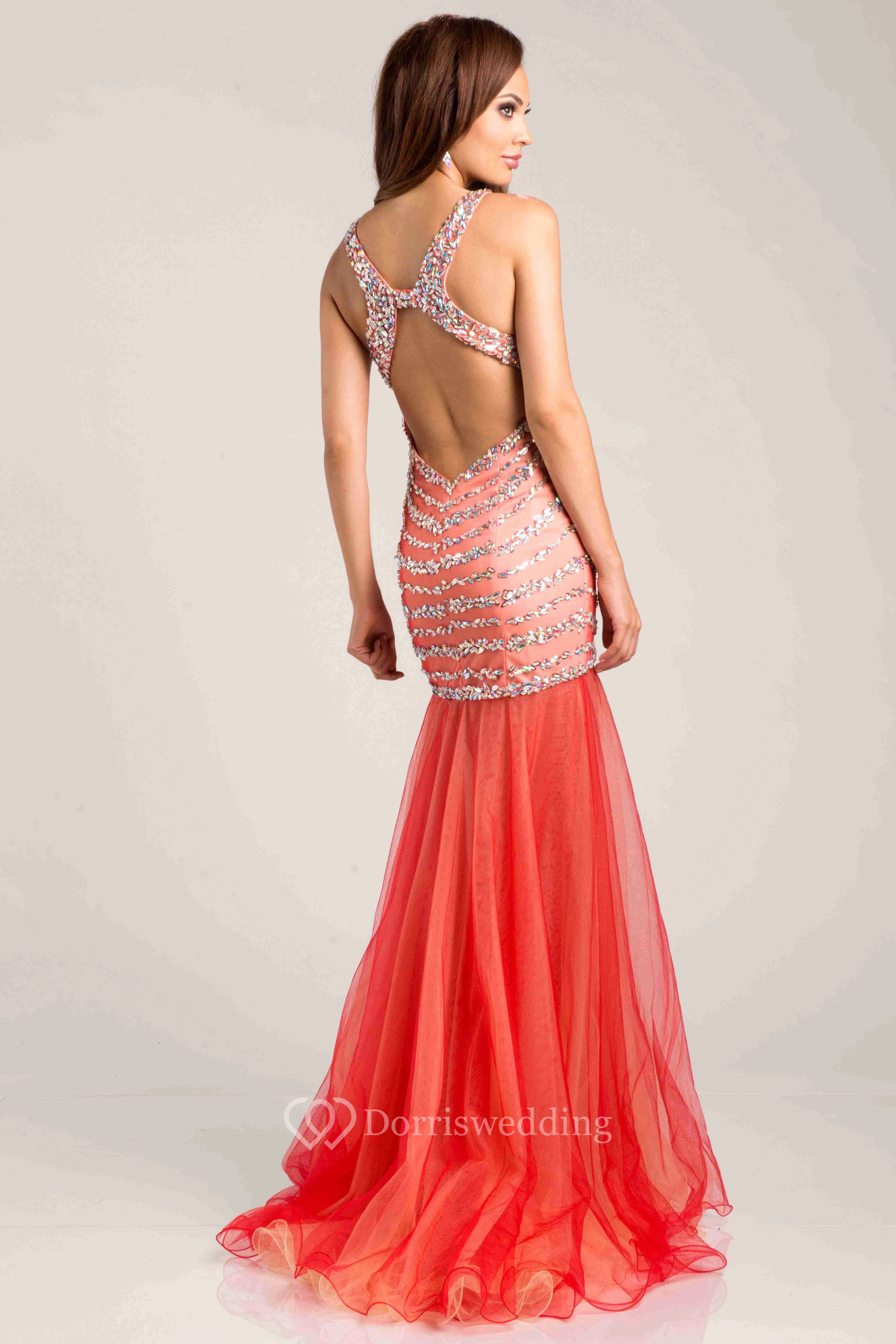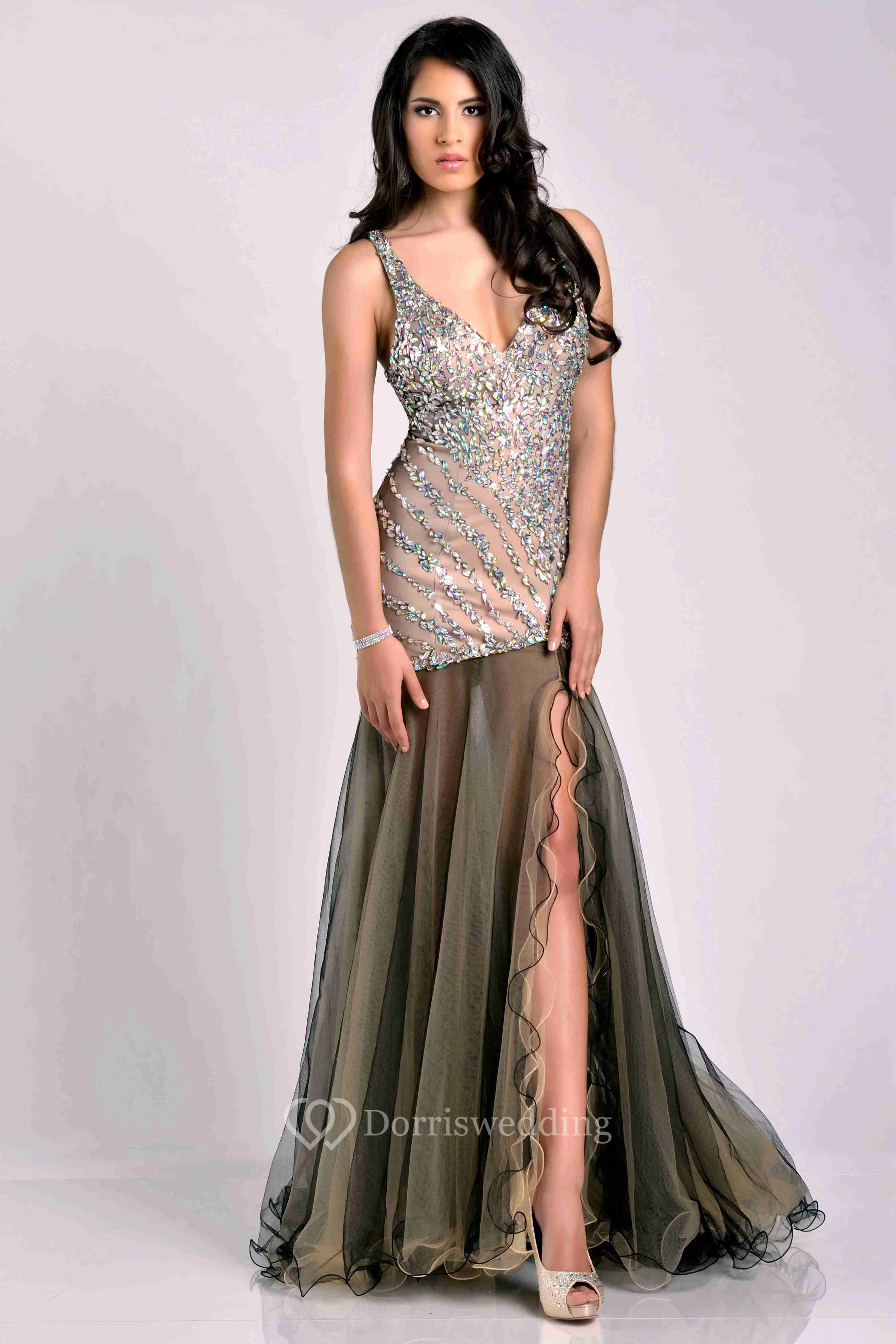 Fit And Flare V-Neck Sleeveless Prom Dress With Tulle Skirt And Sequined Bodice