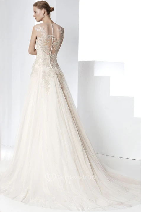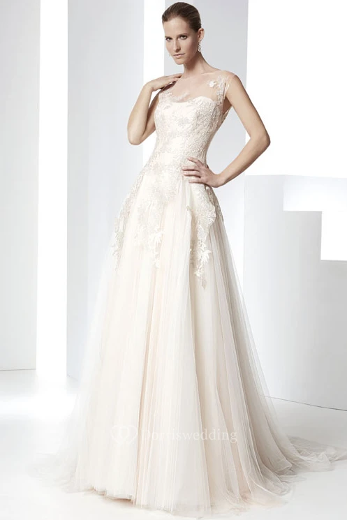 Floor-Length Bateau Appliqued Tulle Wedding Dress With Court Train And Illusion