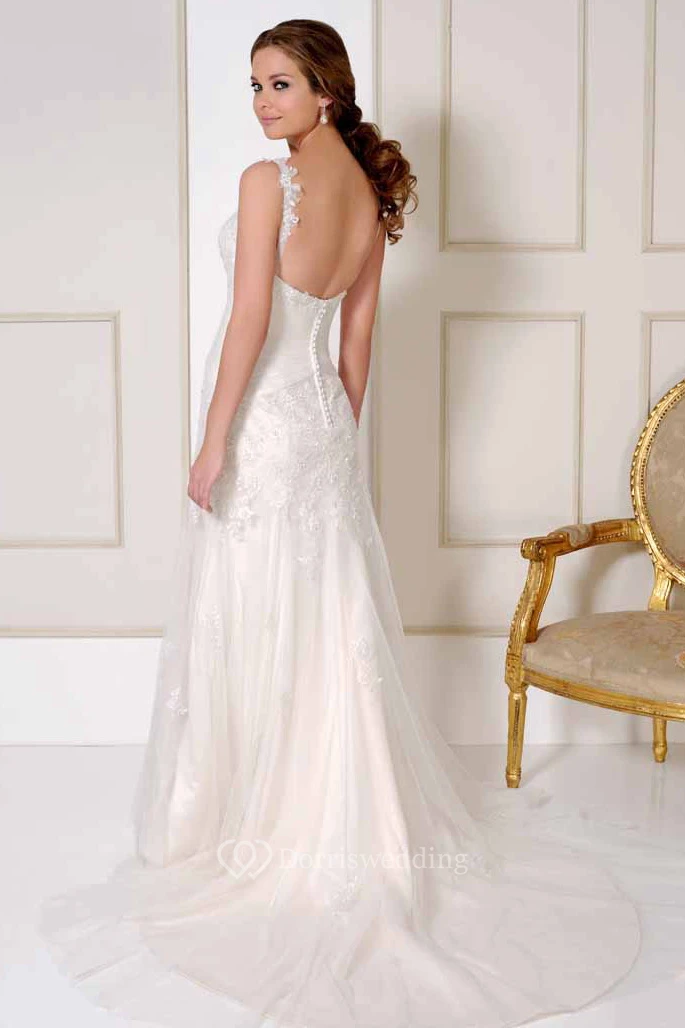 Floor-Length Bateau Appliqued Tulle Wedding Dress With Court Train And V Back