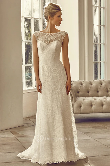 Floor-Length Bateau Cap-Sleeve Appliqued Lace Wedding Dress