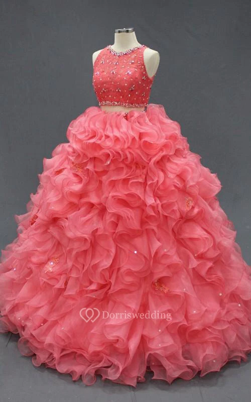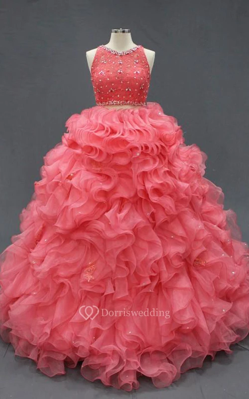Floor-Length Beading Ruffles Zipper Corset Back Lace Organza Dress