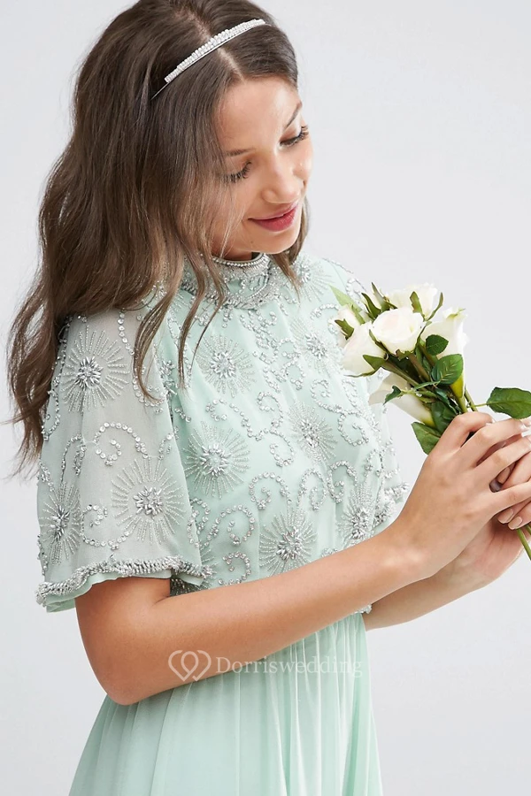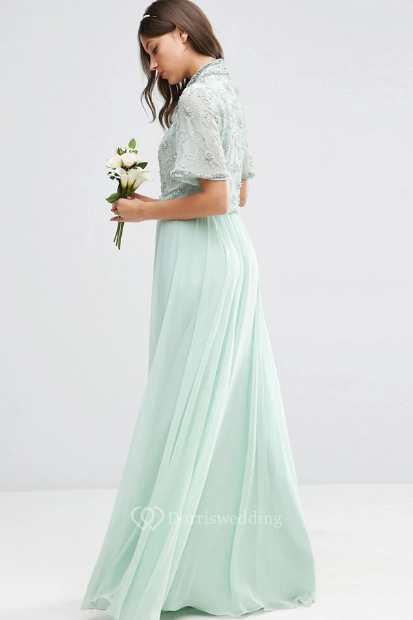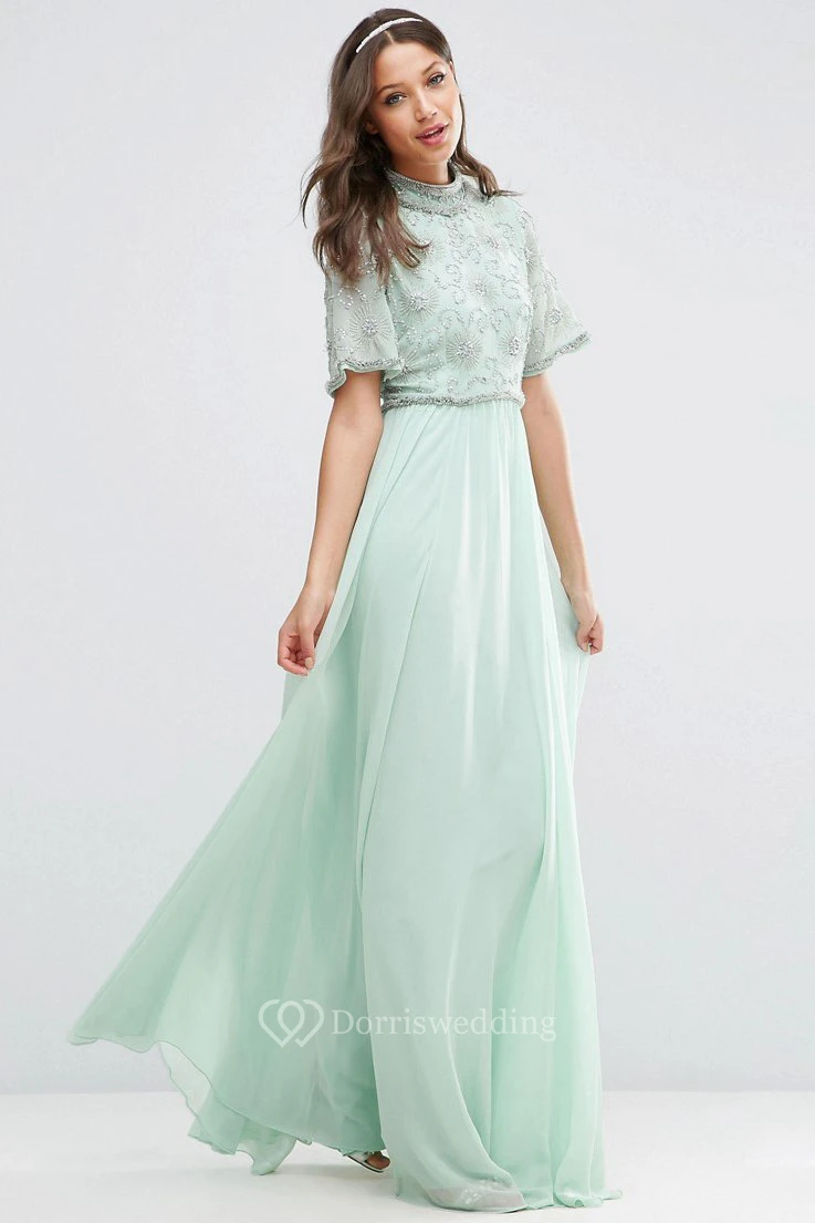 Floor-Length Bell Sleeve High Neck Beaded Chiffon Bridesmaid Dress With Pleats