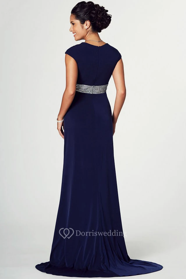 Floor-Length Cap Sleeve V-Neck Jeweled Jersey Prom Dress With Brush Train