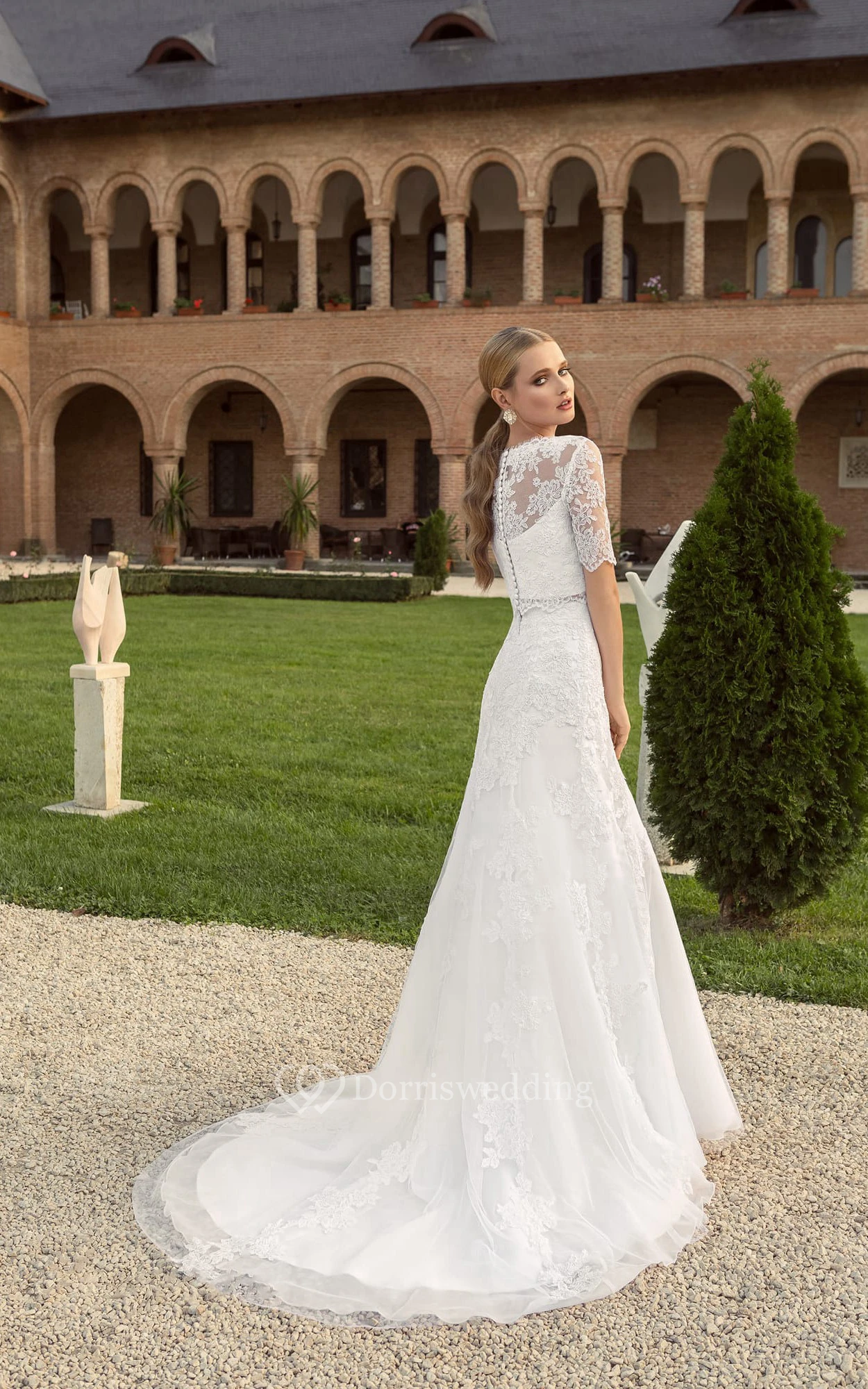 Floor-length Half Sleeve Button Back Lace Dress