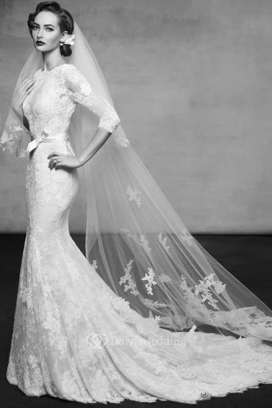 Floor-Length High Neck 3-4-Sleeve Appliqued Lace Wedding Dress With Court Train