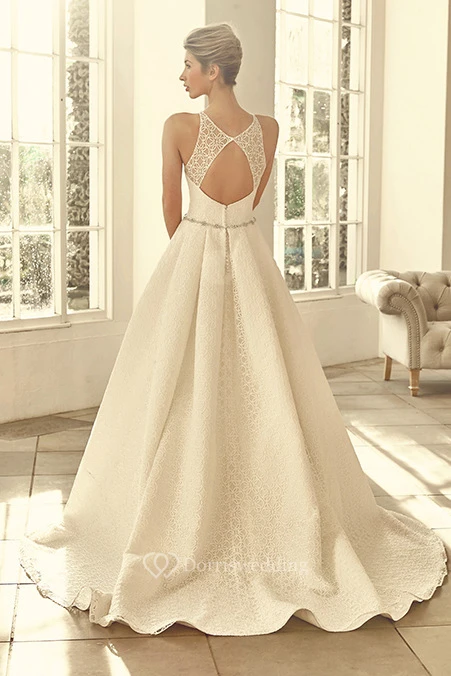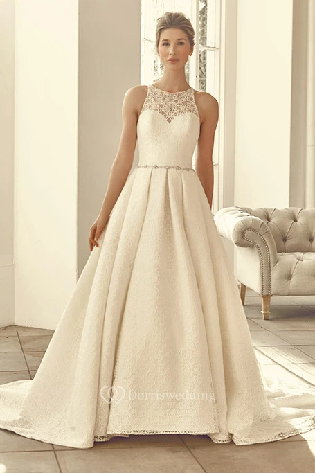 Floor-Length High Neck Appliqued Lace Wedding Dress With Court Train And Keyhole