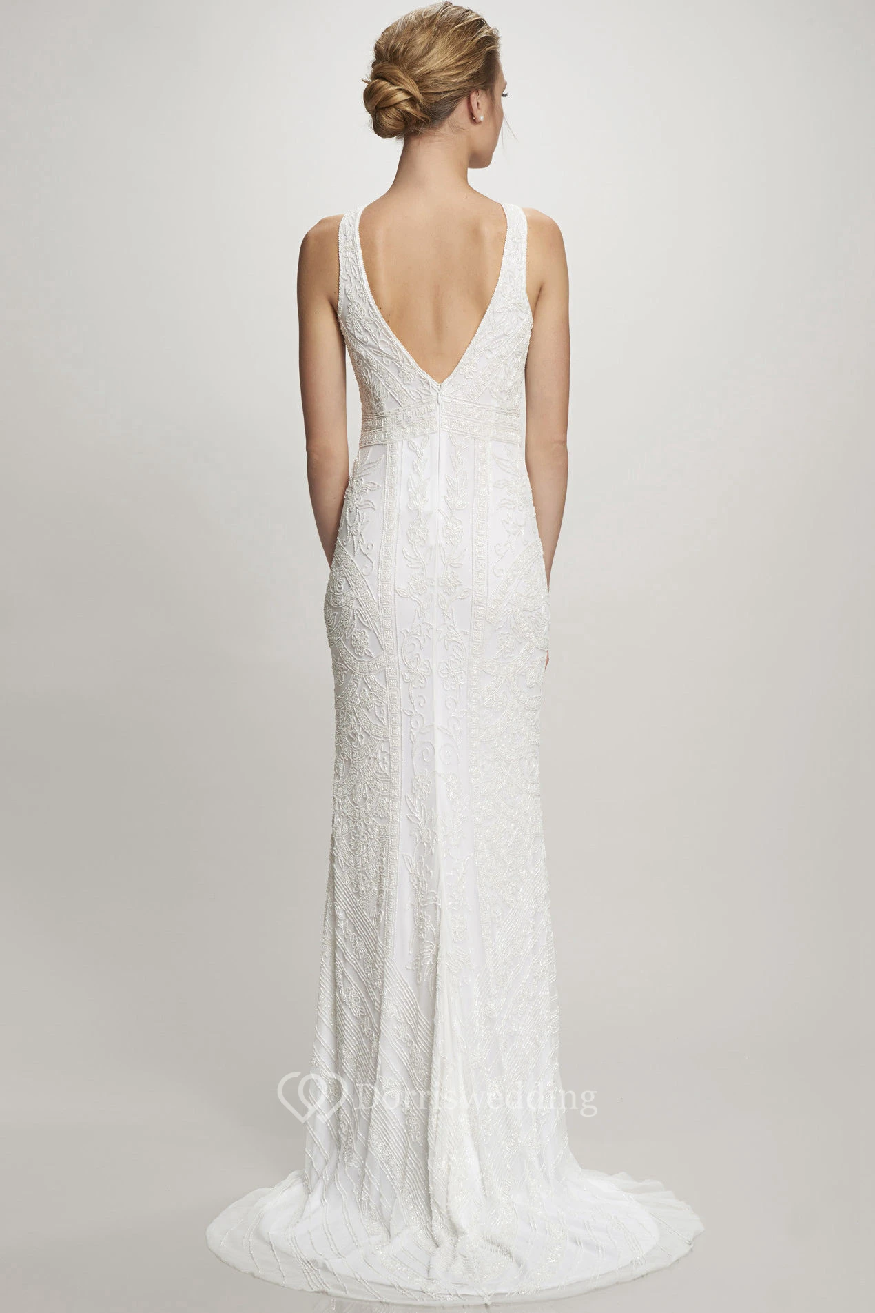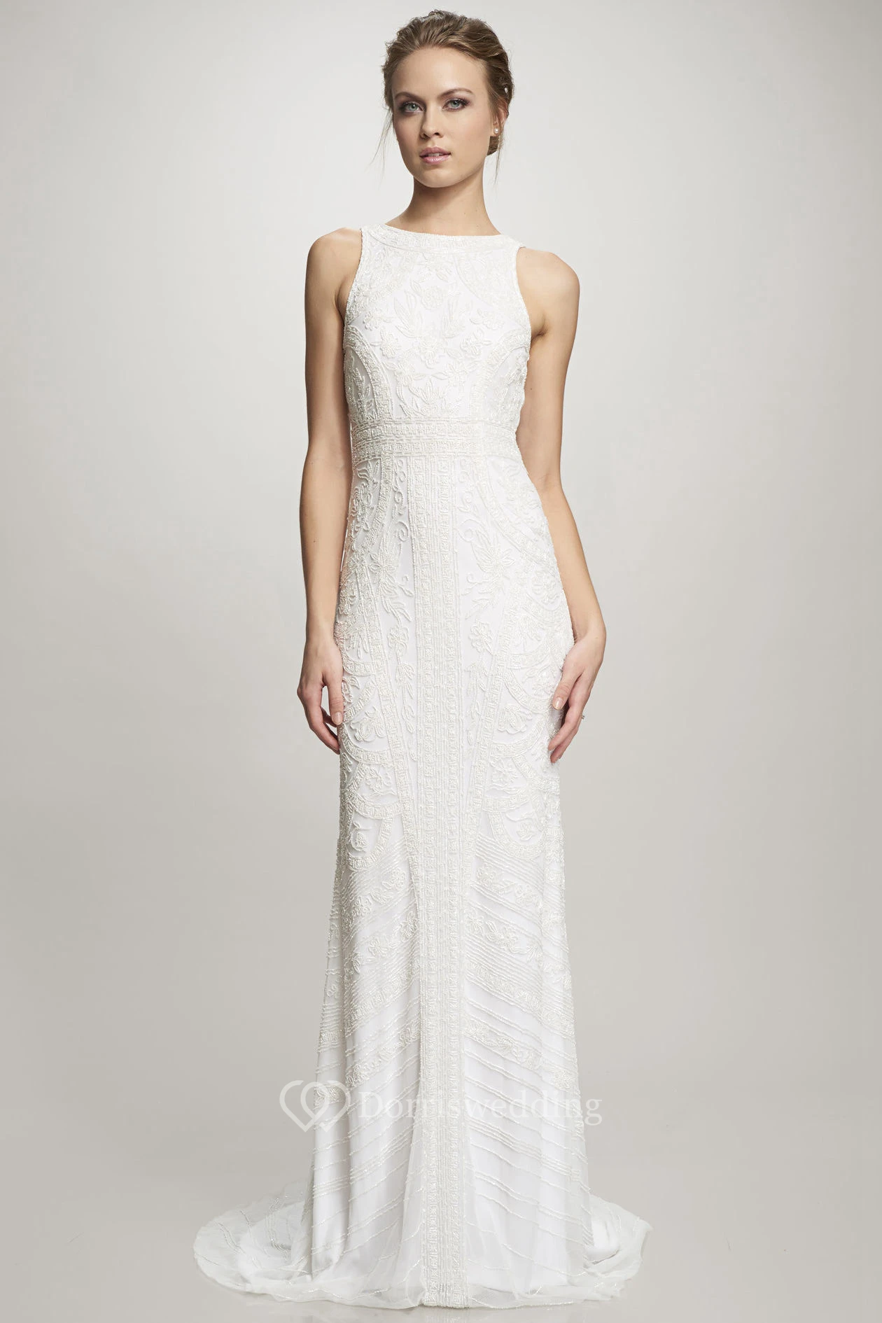 Floor-Length Jewel Lace Wedding Dress With Brush Train And V Back