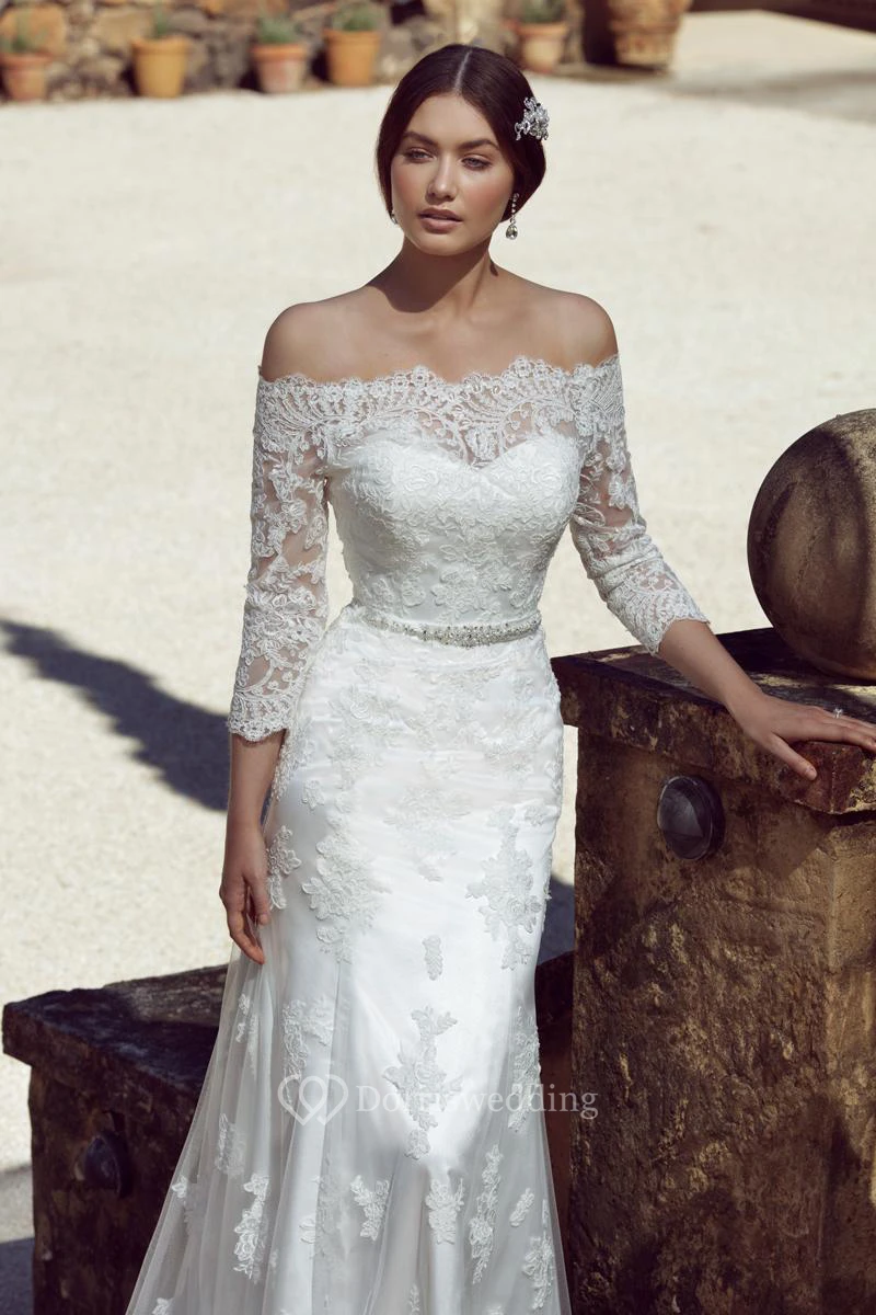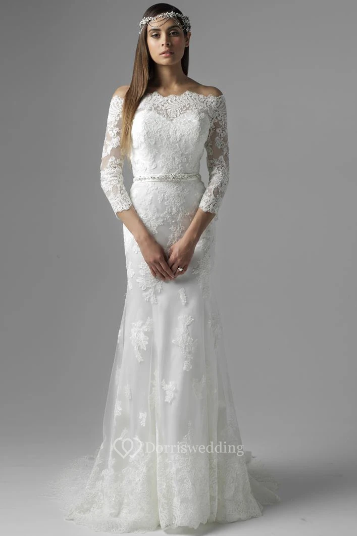 Floor-Length Jeweled Off-The-Shoulder 3-4 Sleeve Lace Modest Wedding Dress