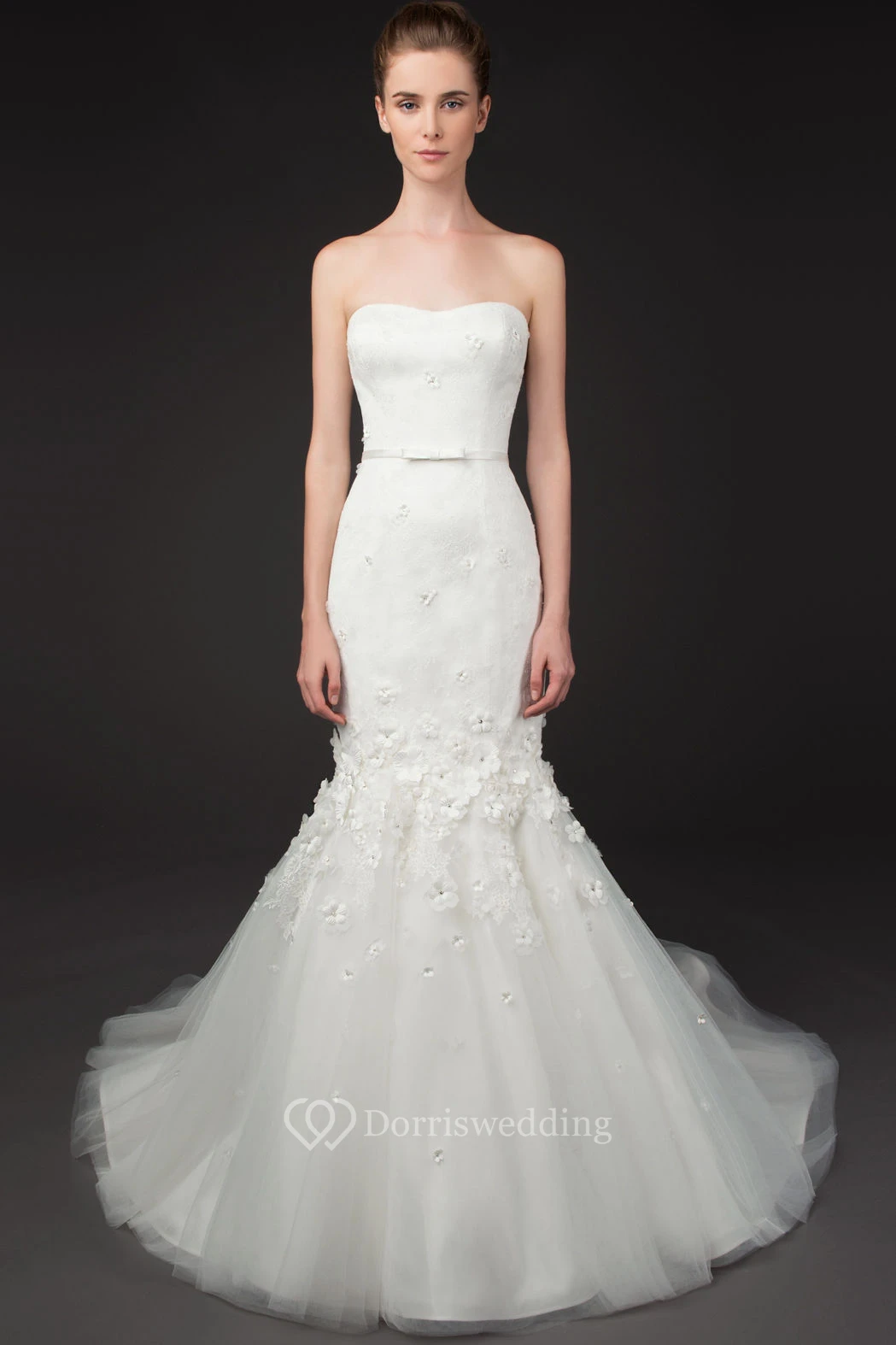 Floor-Length Mermaid Floral Strapless Tulle Wedding Dress With Court Train