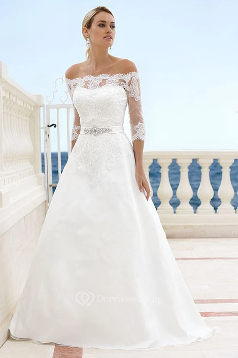 Floor-Length Off-The-Shoulder Appliqued 3-4-Sleeve Satin Wedding Dress
