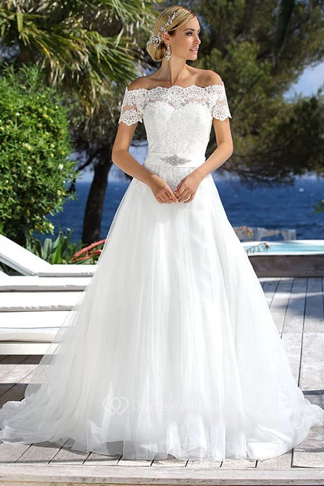 Floor-Length Off-The-Shoulder Jeweled Tulle Wedding Dress With Appliques