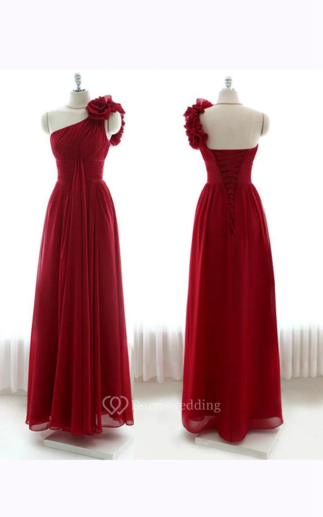 Floor-length One-shoulder Chiffon Dress with Flowers
