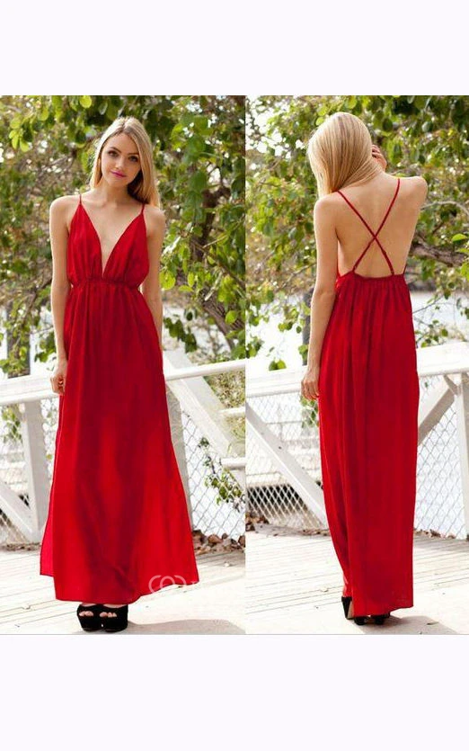 Floor-length Pleats V-neck Backless Chiffon Dress