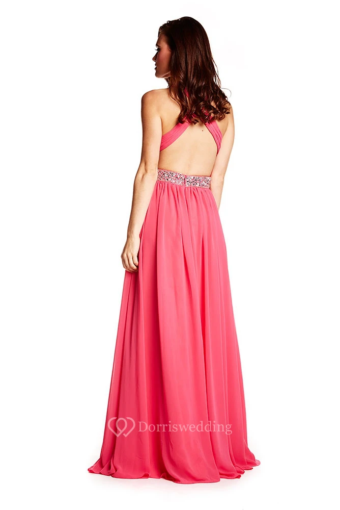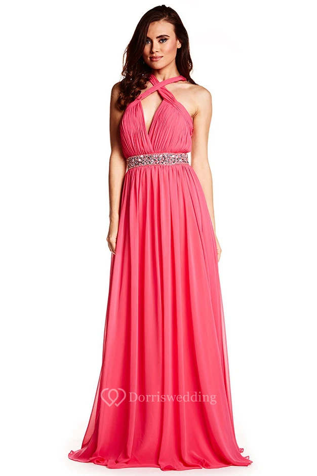 Floor-Length Ruched Sleeveless Halter Chiffon Prom Dress