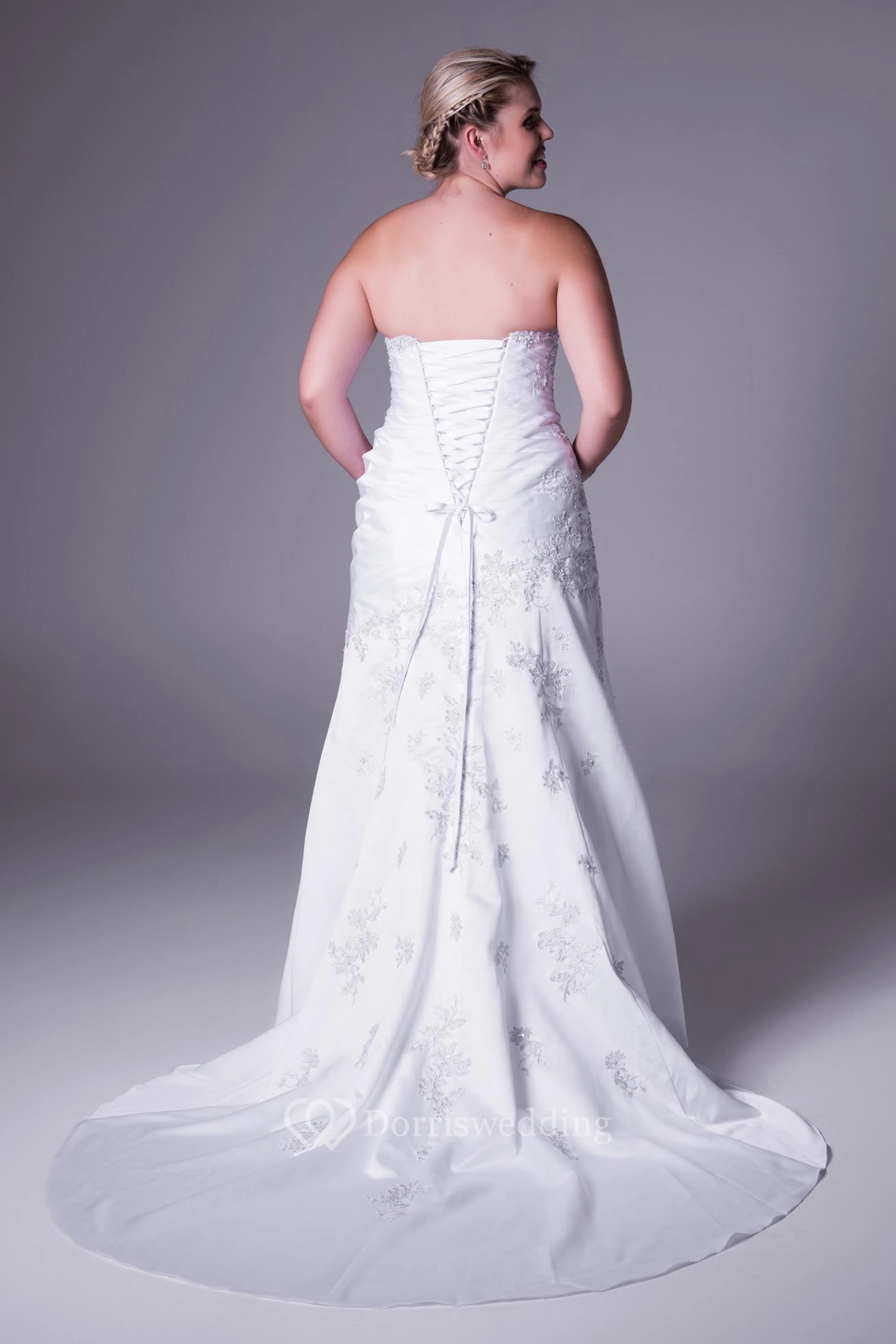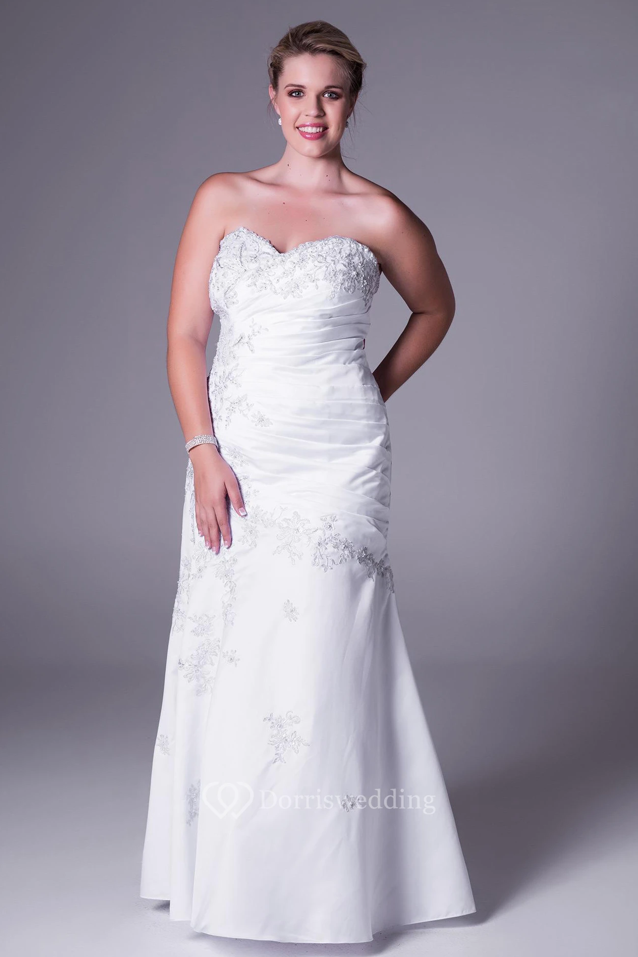 Floor-Length Ruched Sweetheart Satin Plus Size Wedding Dress With Appliques And Corset Back