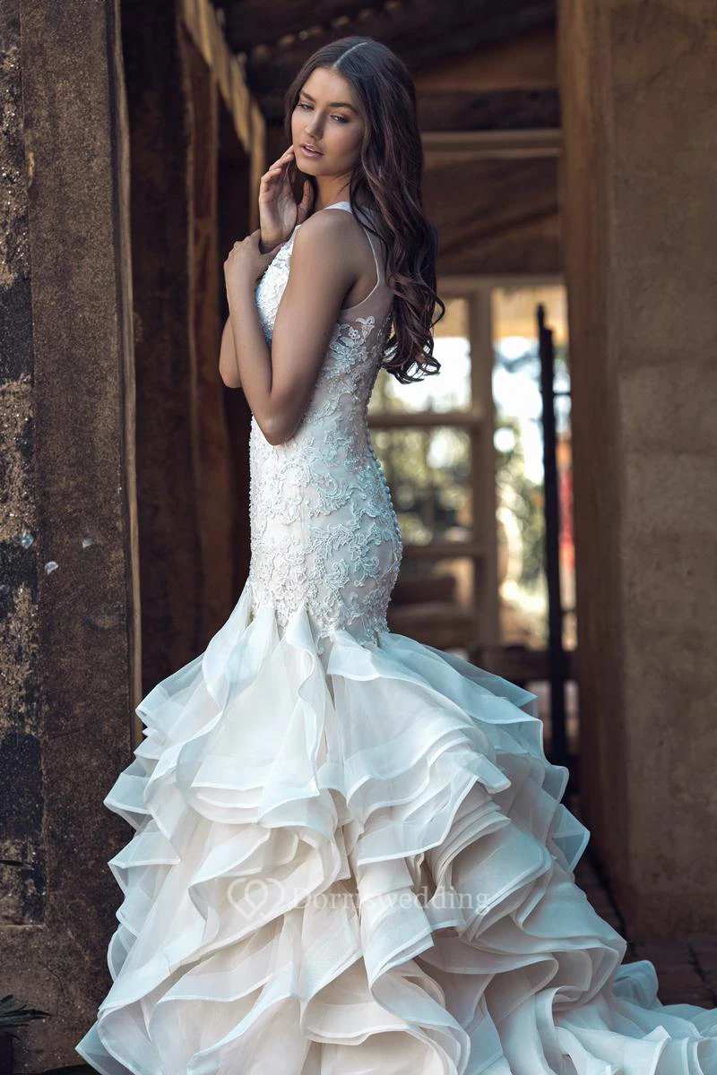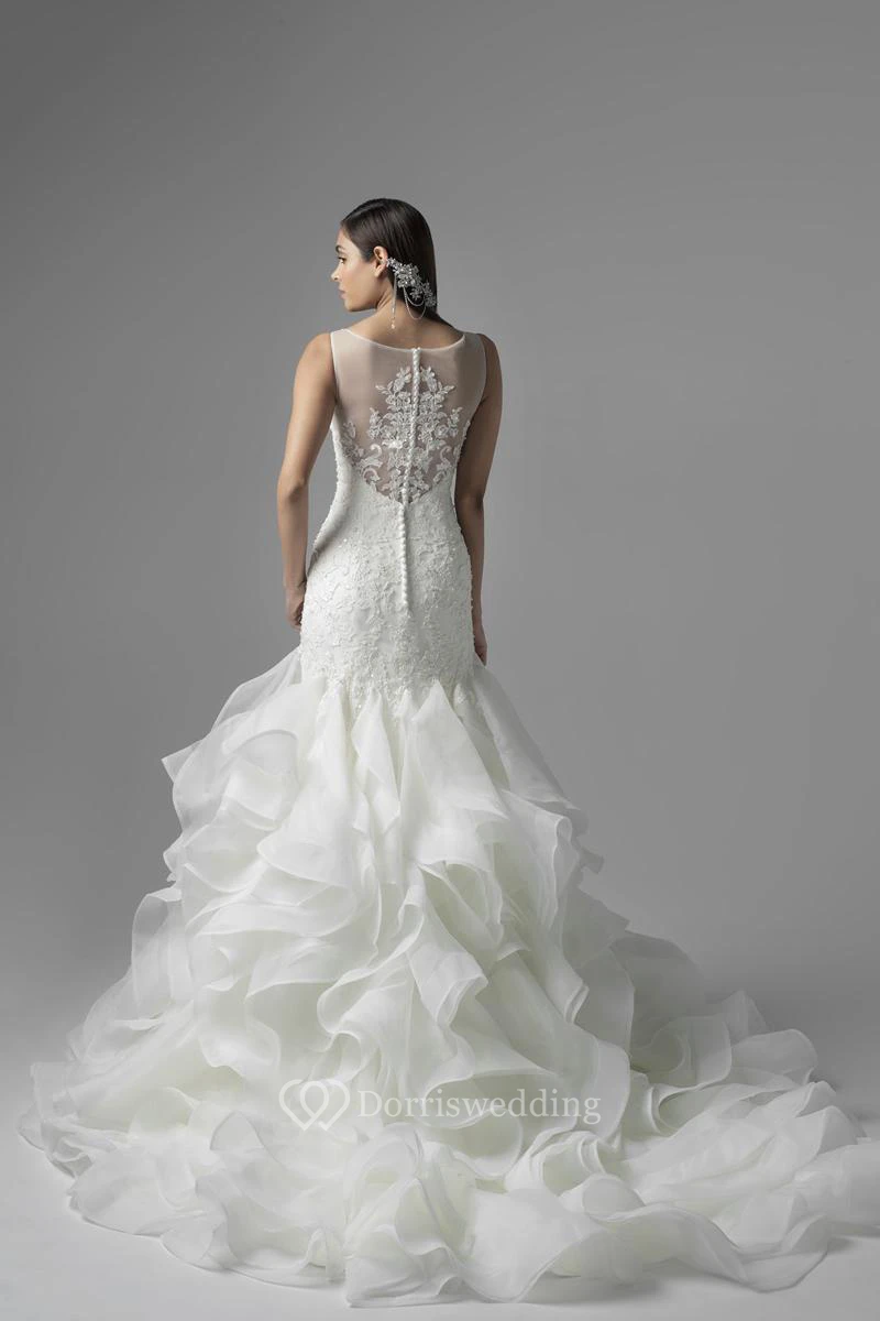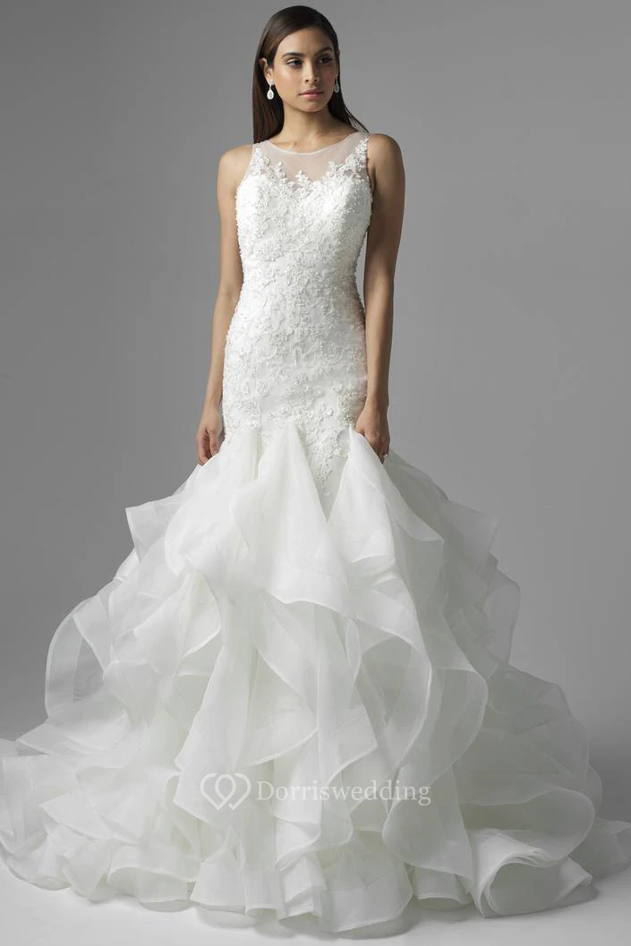 Floor-Length Scoop Appliqued Lace Wedding Dress With Court Train And Illusion