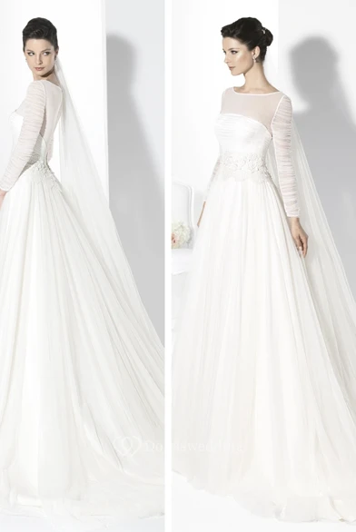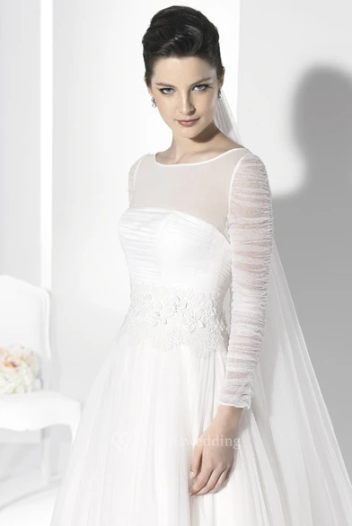 Floor-Length Scoop Appliqued Long-Sleeve Tulle Wedding Dress