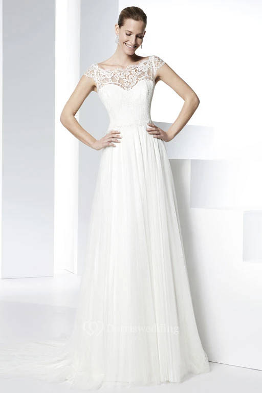 Floor-Length Scoop Appliqued Tulle Wedding Dress With Brush Train And Illusion