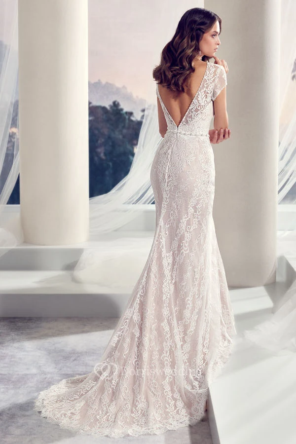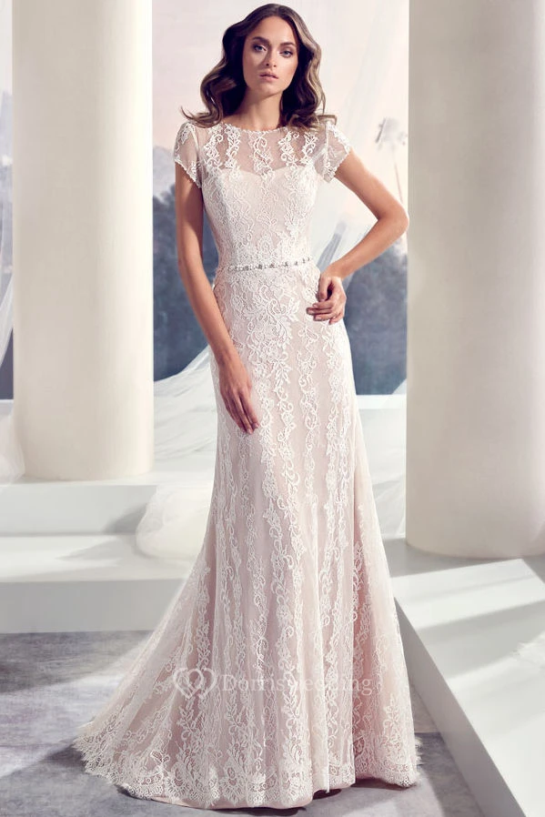 Floor-Length Scoop Jeweled Cap-Sleeve Lace Modest Wedding Dress With Brush Train And V Back