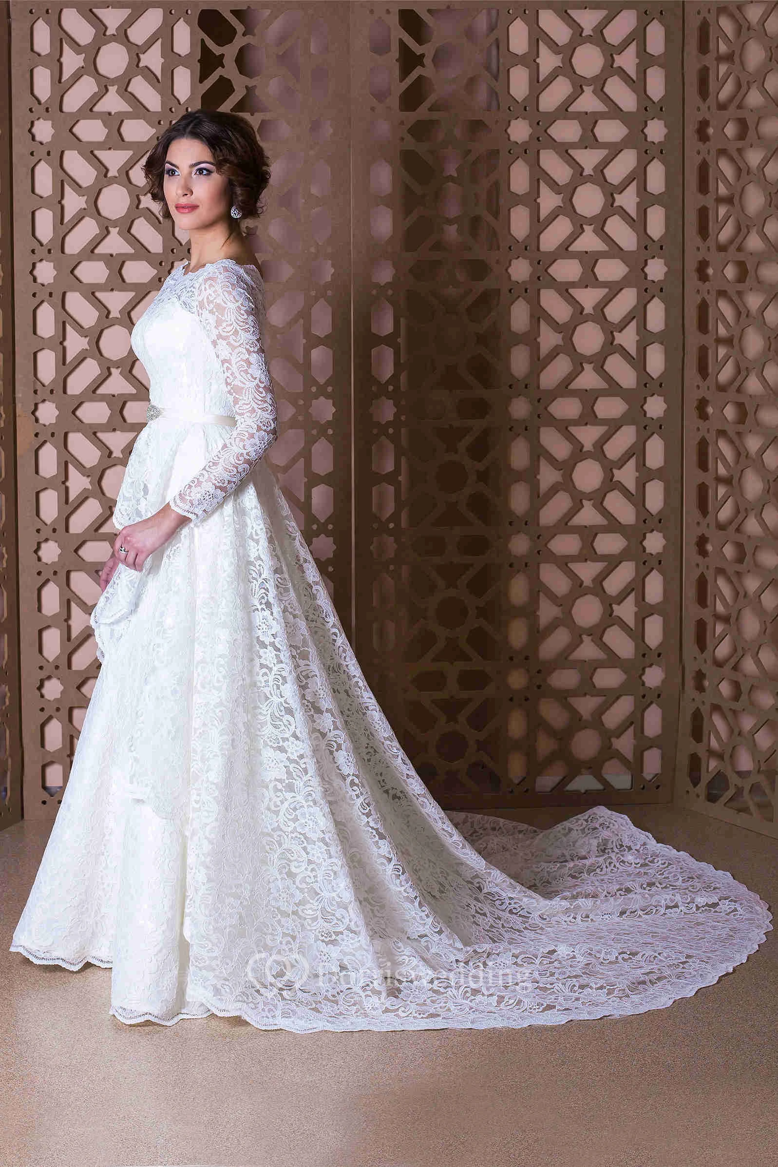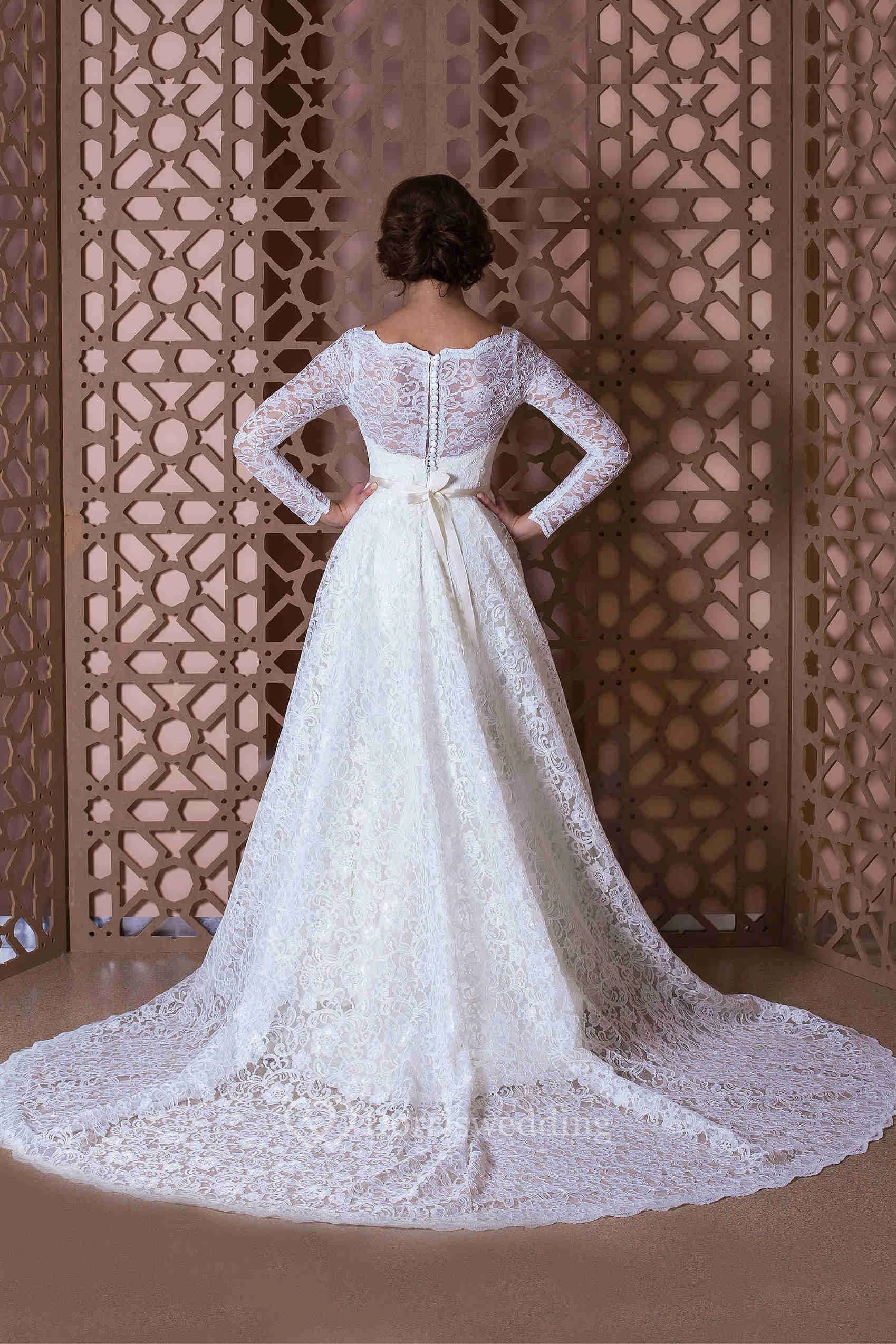 Floor-Length Scoop Long-Sleeve Bowed Lace Wedding Dress