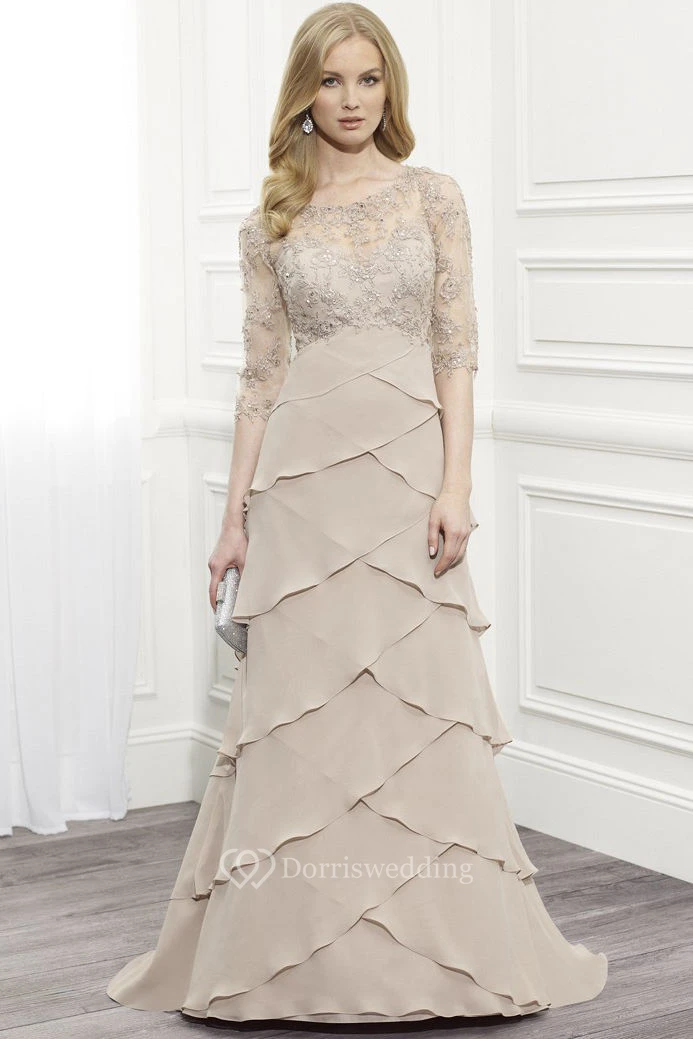Floor-Length Scoop Neck Tiered Half Sleeve Chiffon Formal Dress