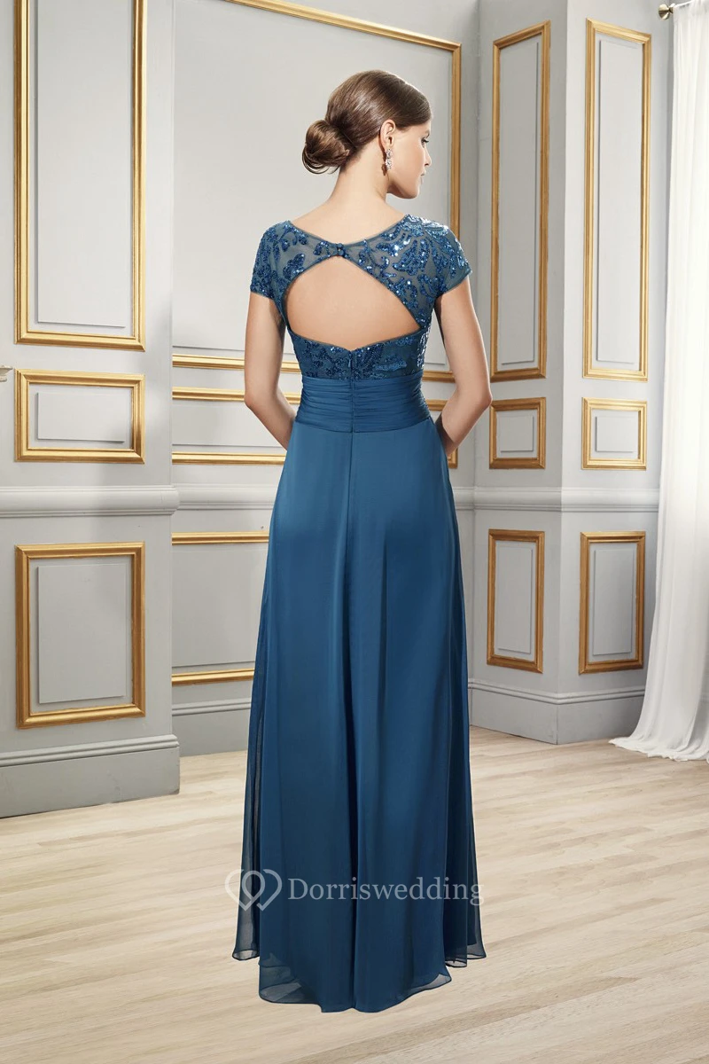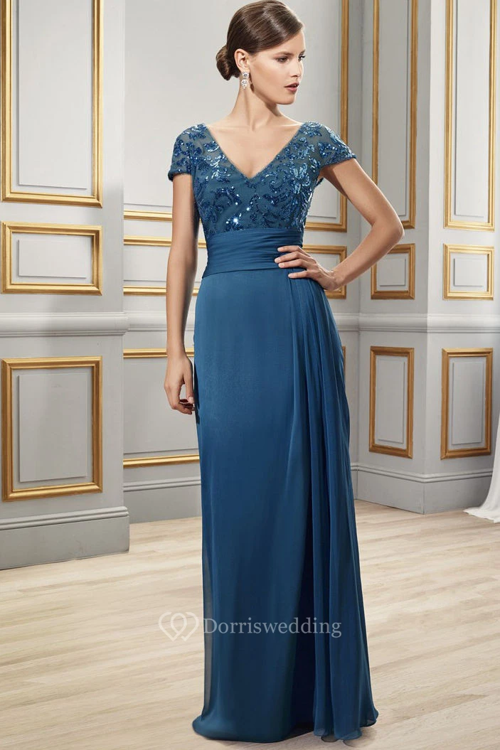 Floor-Length Sequined Cap Sleeve V-Neck Chiffon Formal Dress
