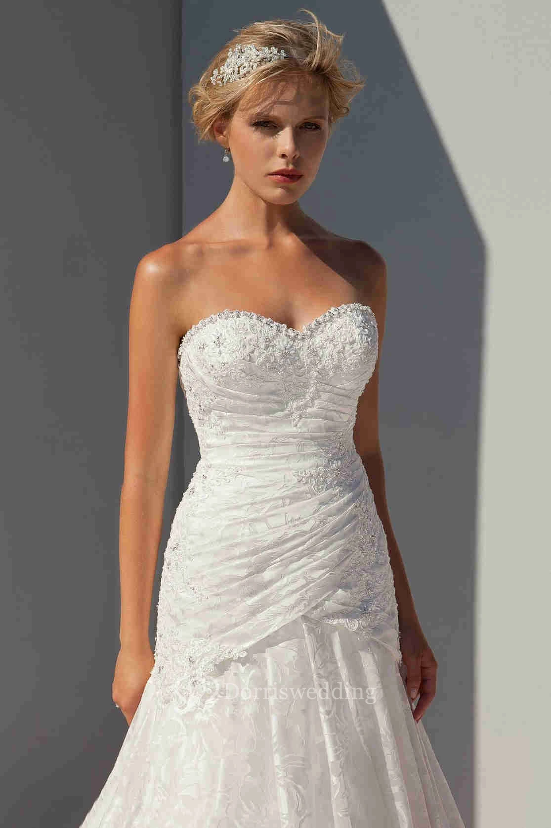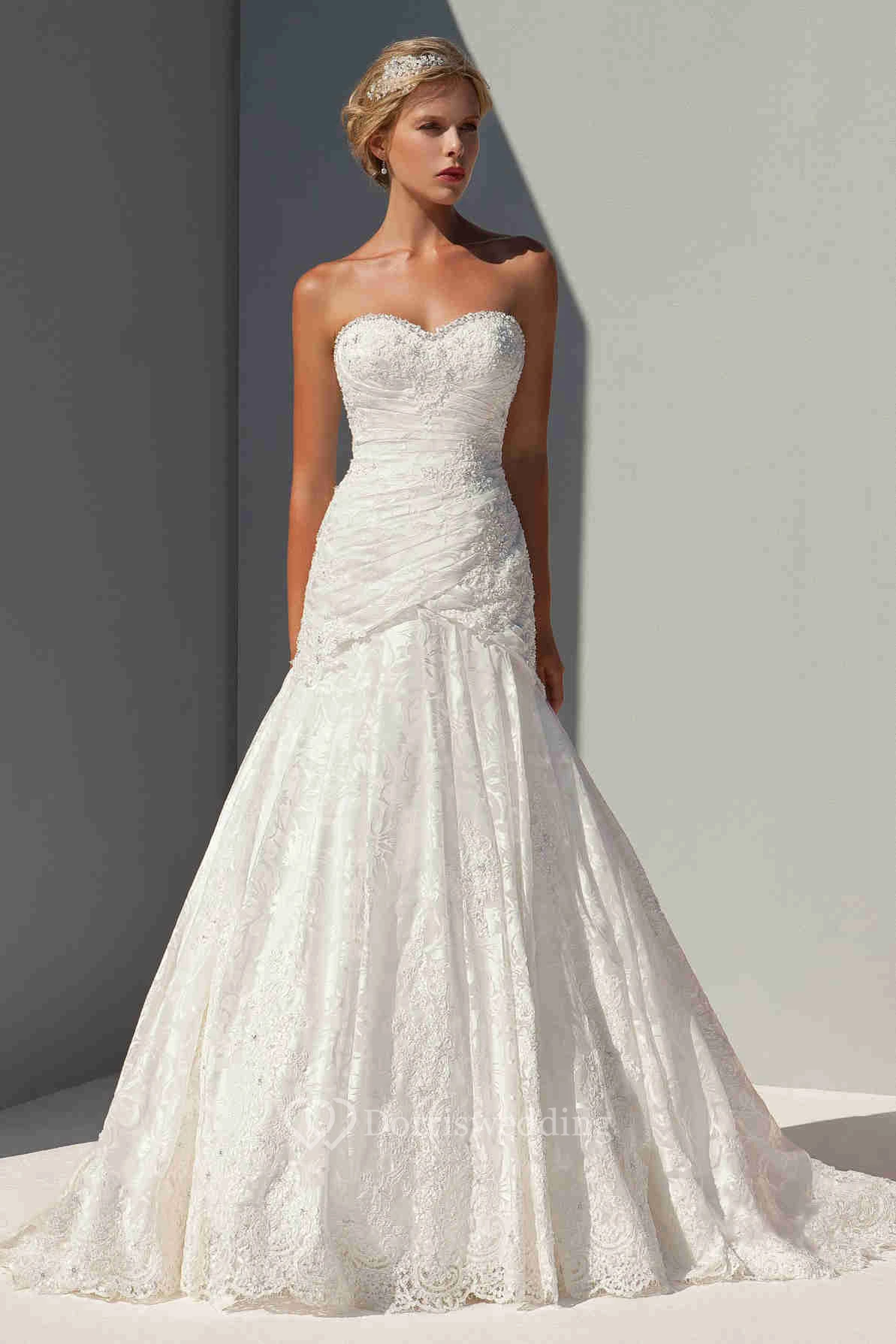 Floor-Length Sleeveless Appliqued Sweetheart Lace Wedding Dress With Ruching And Beading