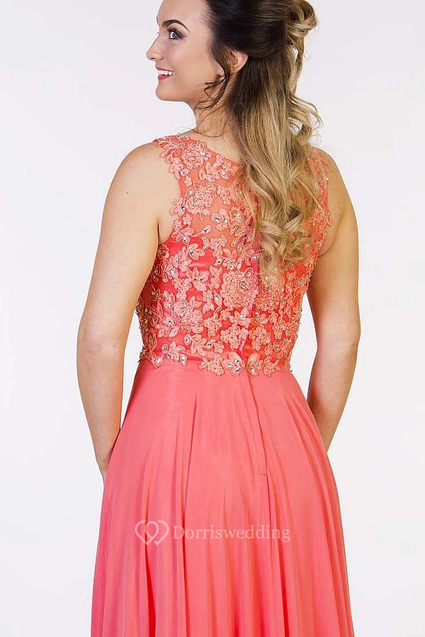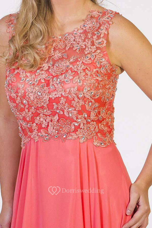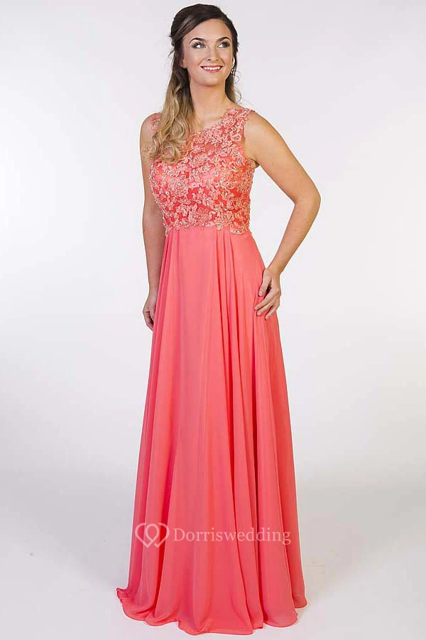 Floor-Length Sleeveless Beaded Scoop Chiffon Prom Dress With Pleats And Appliques