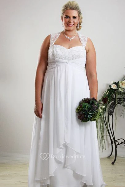 Floor-Length Sleeveless Queen Anne Draped Chiffon Plus Size Wedding Dress With Appliques