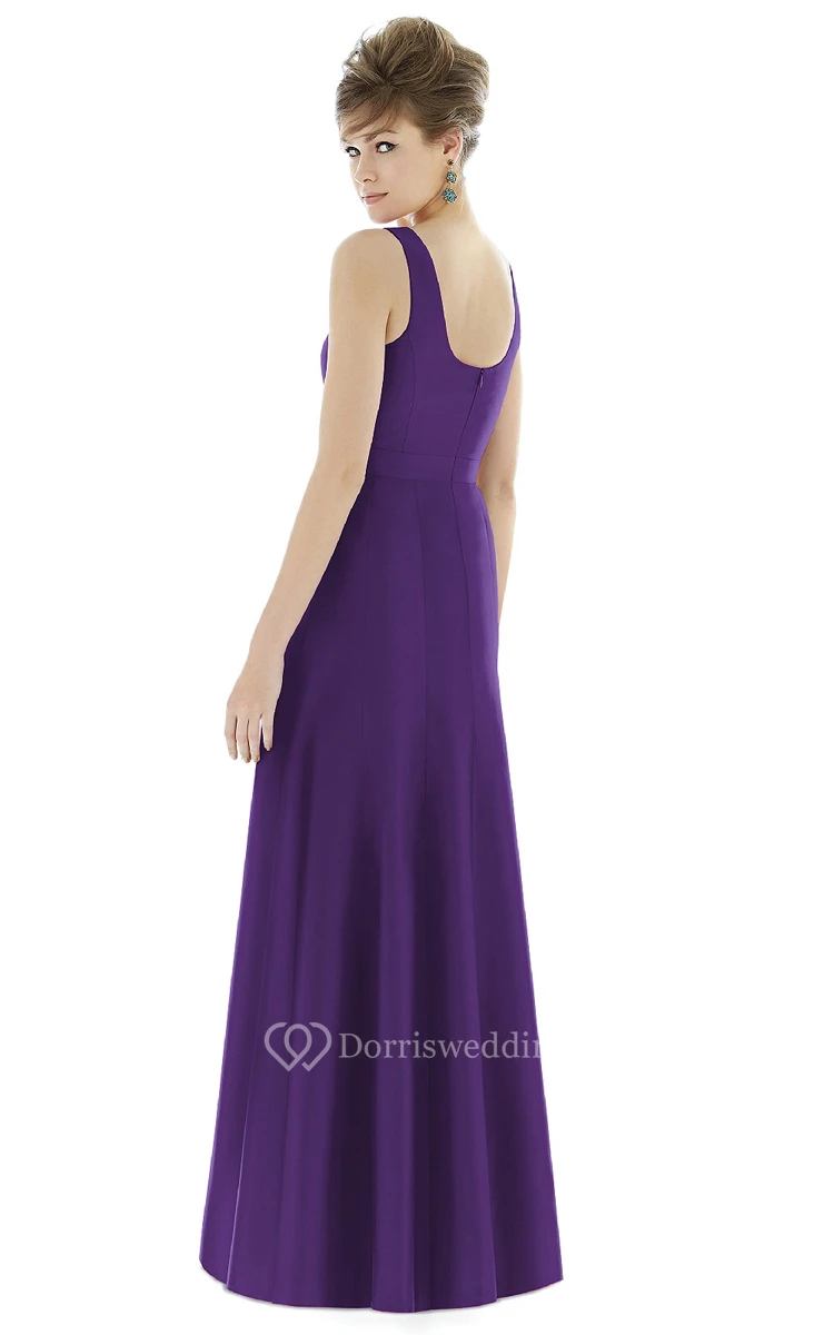 Floor-Length Sleeveless Satin Gown with Scoop Neckline and Ruching