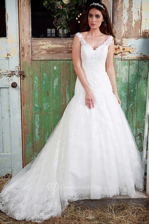 Floor-Length Sleeveless V-Neck Appliqued Lace Wedding Dress