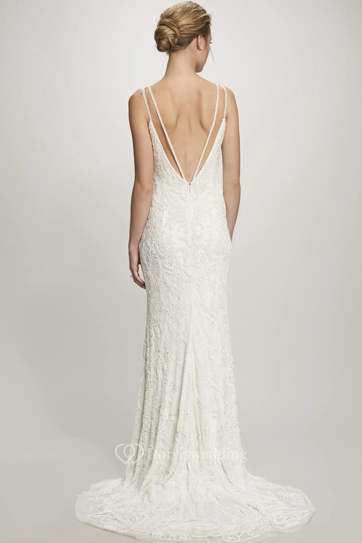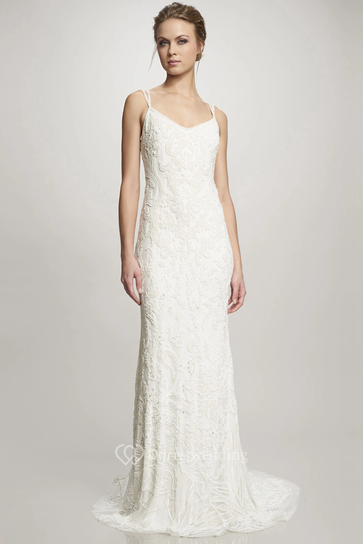 Floor-Length Spaghetti Lace Wedding Dress With Brush Train And V Back