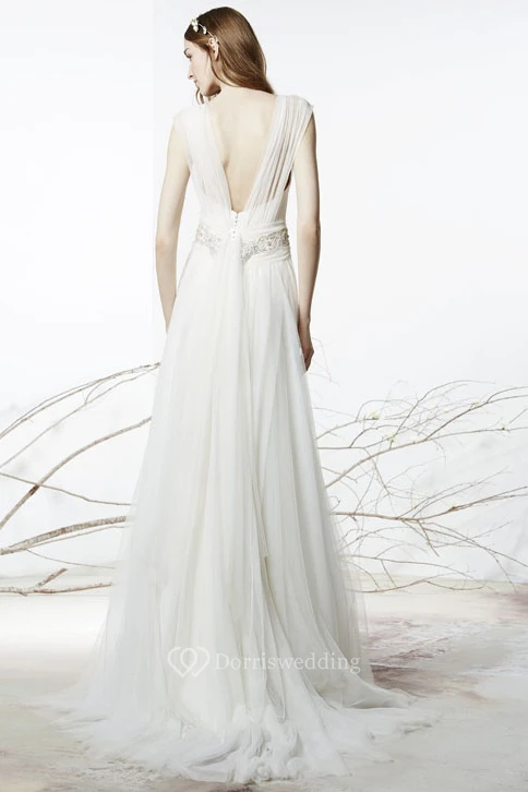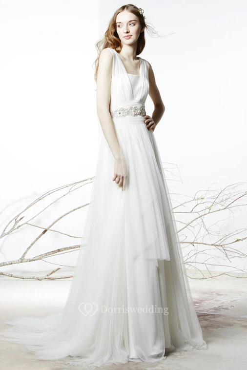 Floor-Length Square Jeweled Tulle Wedding Dress With Brush Train And V Back