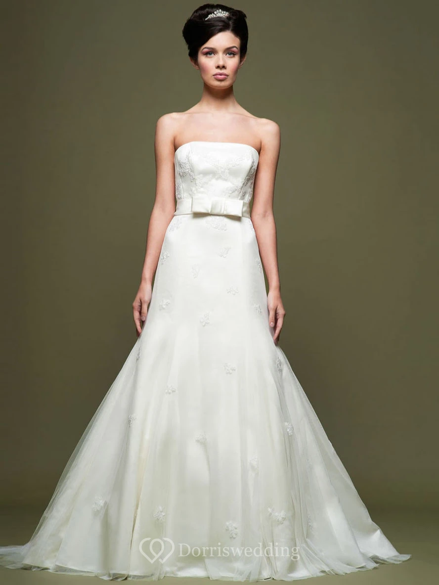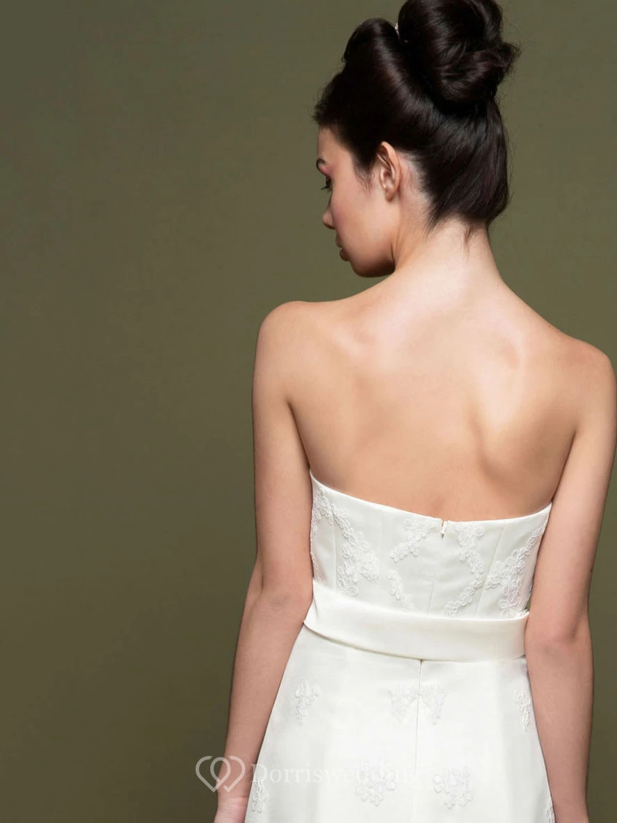 Floor-Length Strapless Appliqued Satin Wedding Dress With Court Train And V Back