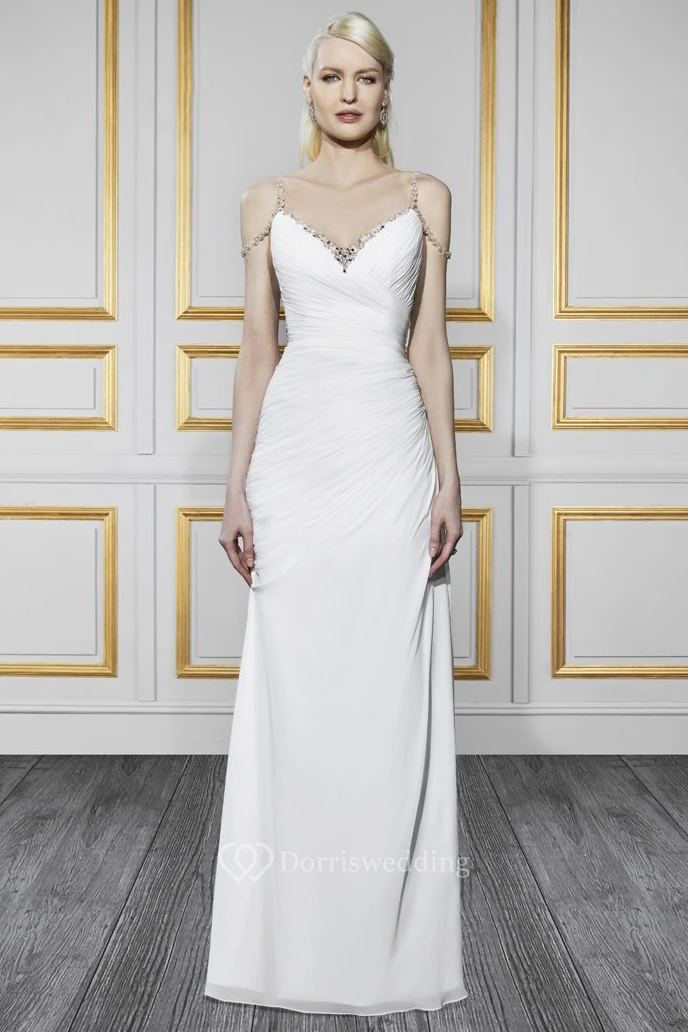Floor-Length Straps Side-Draped Chiffon Wedding Dress With Brush Train And V Back