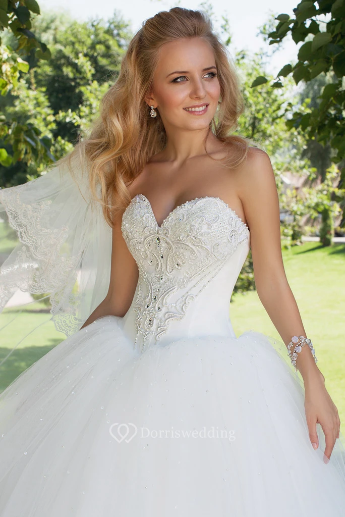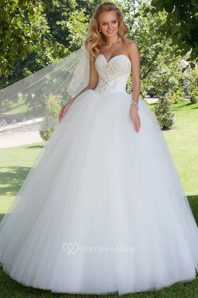 Floor-Length Sweetheart Beaded Tulle Wedding Dress With Court Train And Lace Up