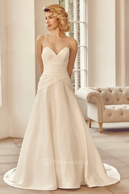 Floor-Length V-Neck Appliqued Satin Wedding Dress With Brush Train And Straps