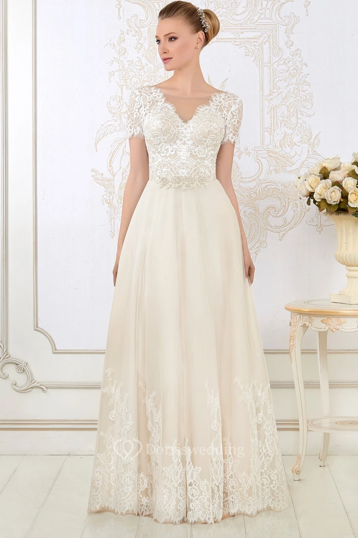 Floor-Length V-Neck Appliqued Short-Sleeve Lace Wedding Dress