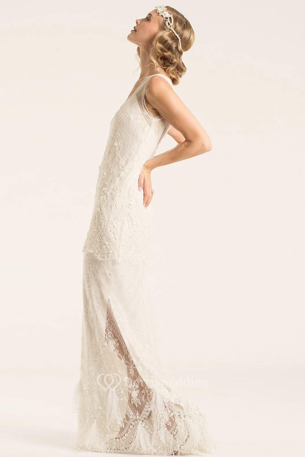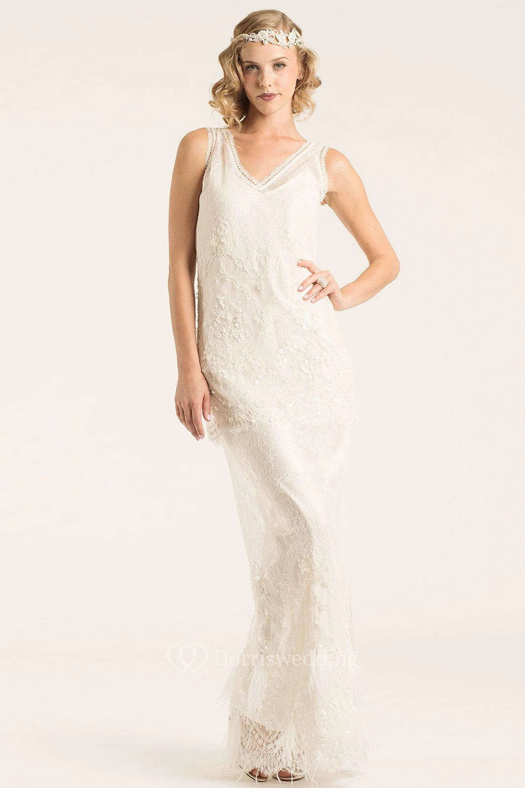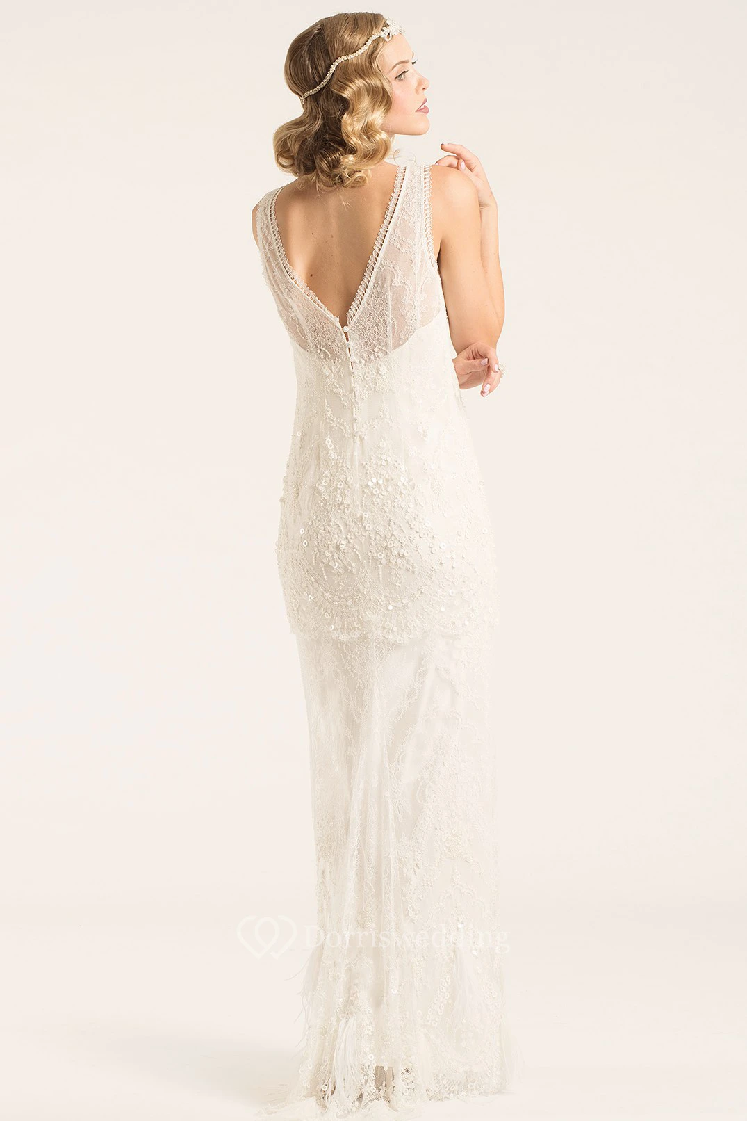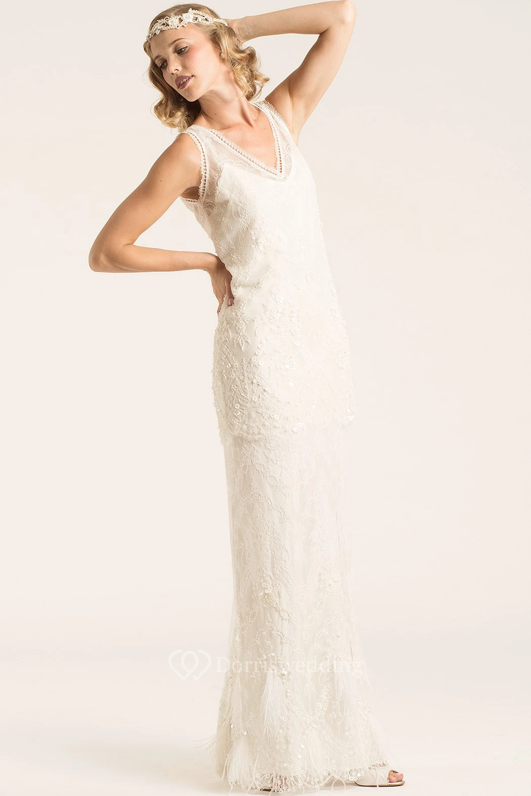 Floor-Length V-Neck Beaded Lace Wedding Dress With Appliques And V Back