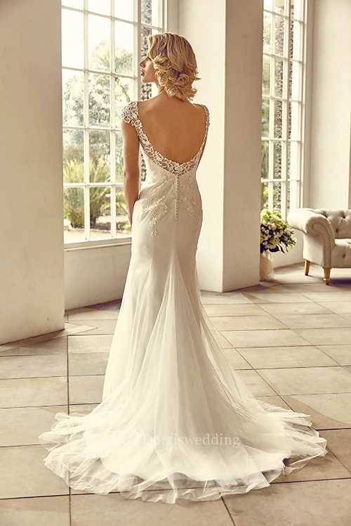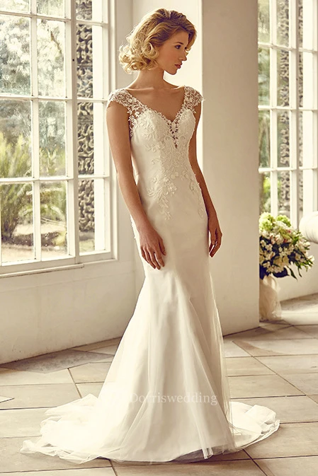 Floor-Length V-Neck Cap-Sleeve Appliqued Lace&Tulle Wedding Dress