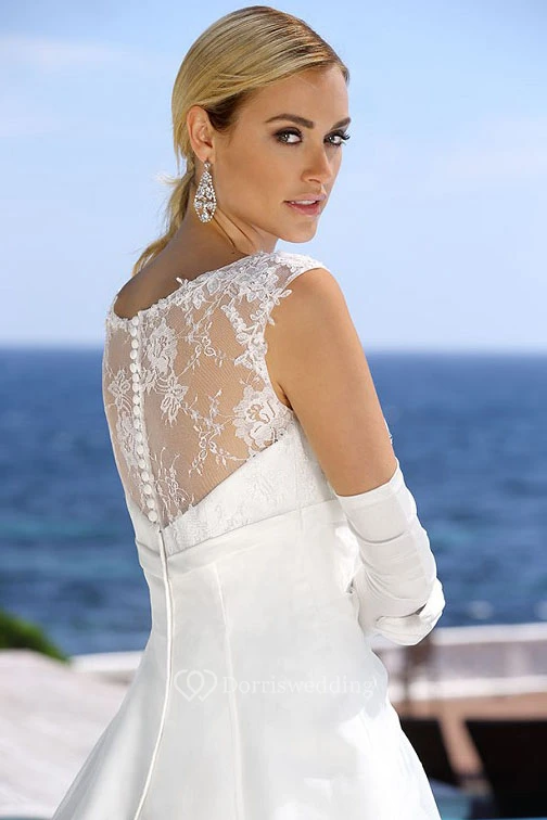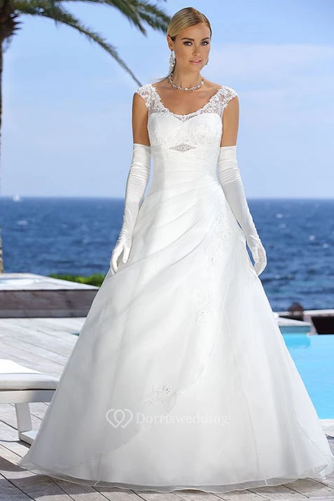 Floor-Length V-Neck Draped Satin Wedding Dress With Appliques And Illusion