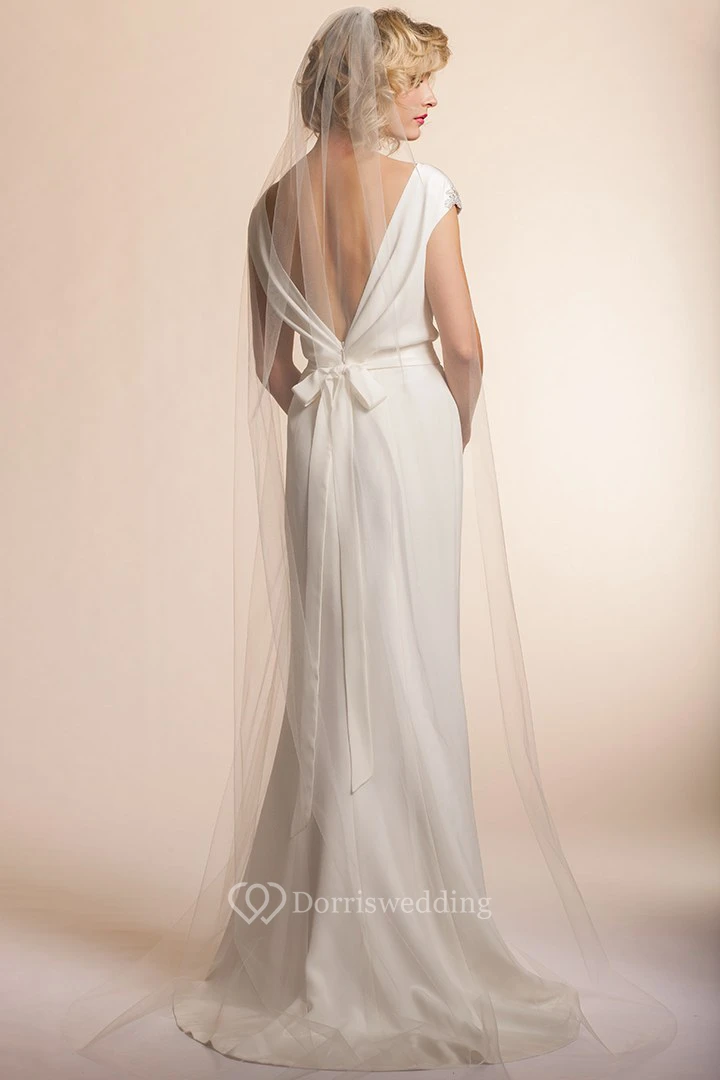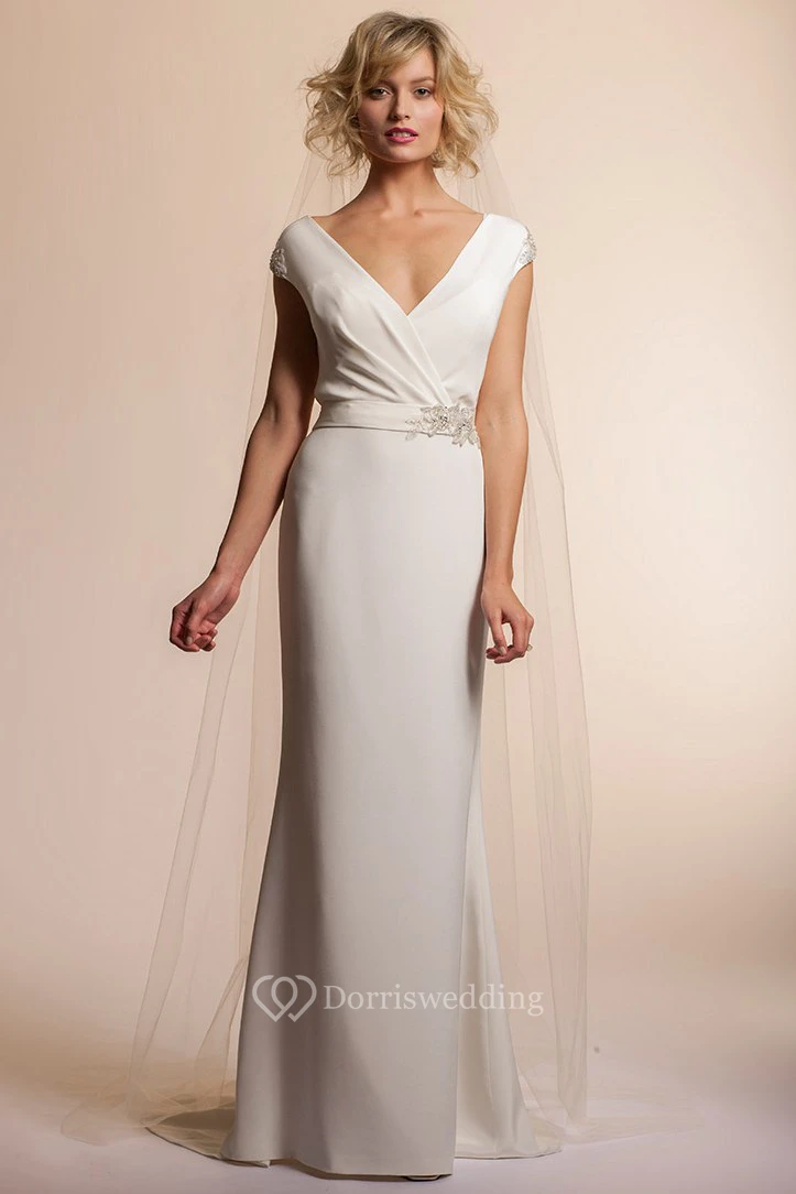 Floor-Length V-Neck Jeweled Cap-Sleeve Chiffon Simple Wedding Dress
