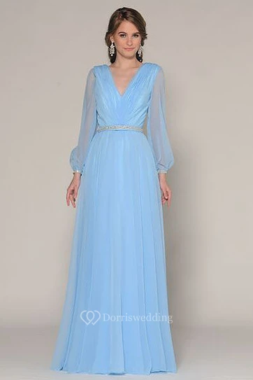Floor-Length V-Neck Puff-Sleeve Prom Dress
