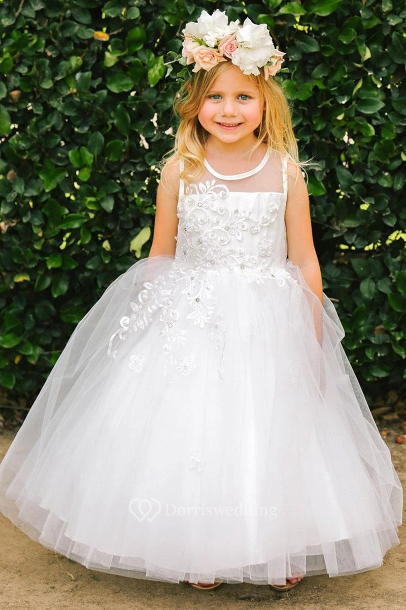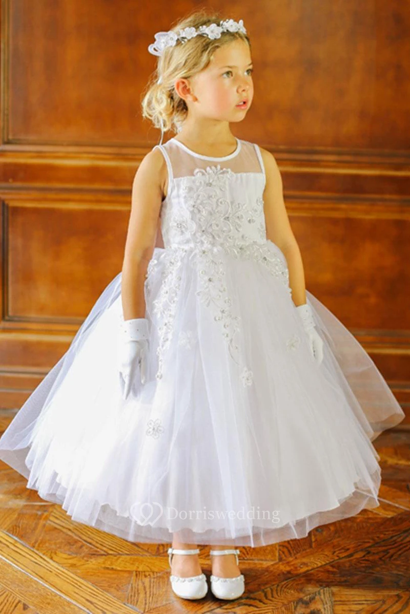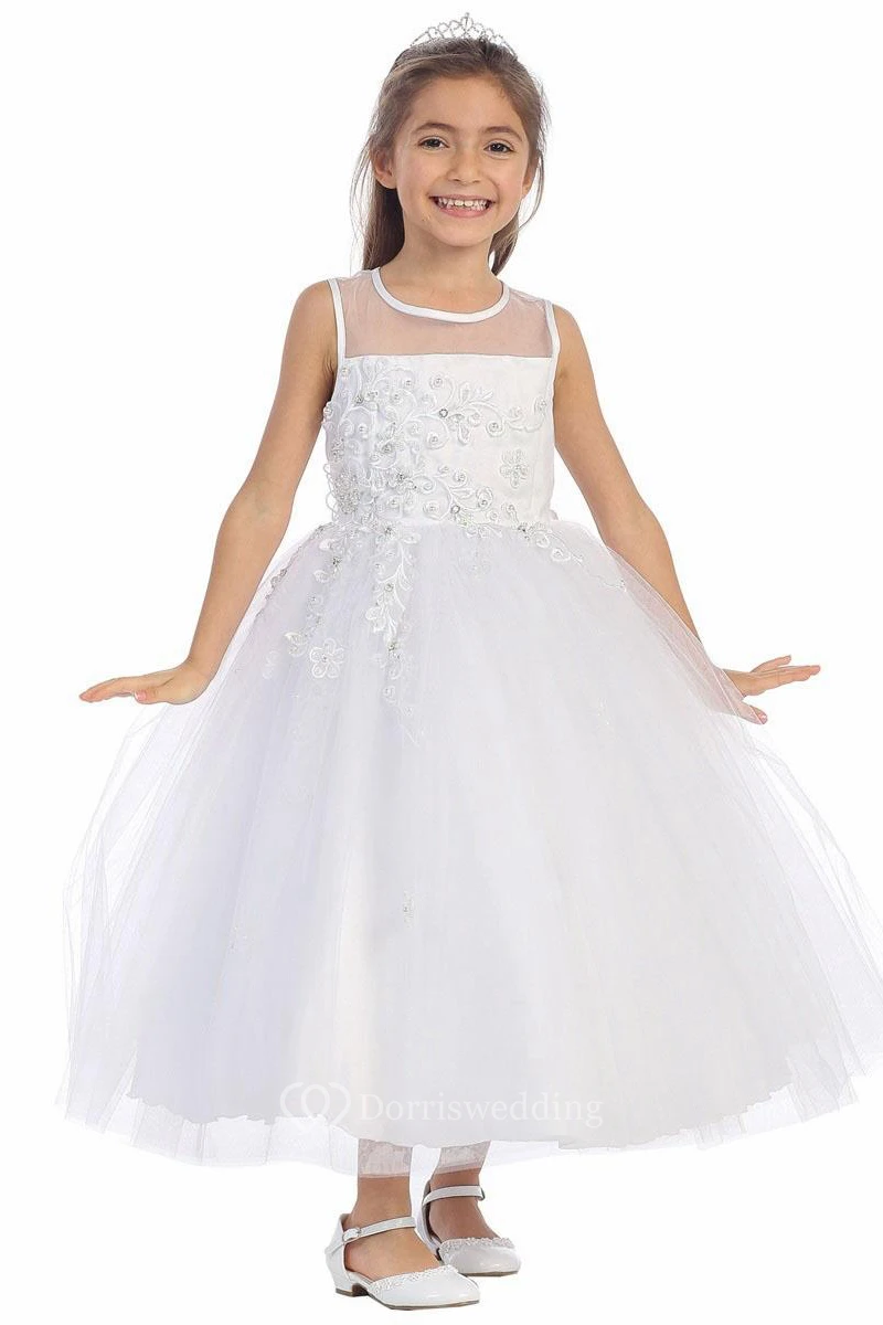Floral Ankle-Length Beaded Appliqued Tulle&Lace Flower Girl Dress With Tiers