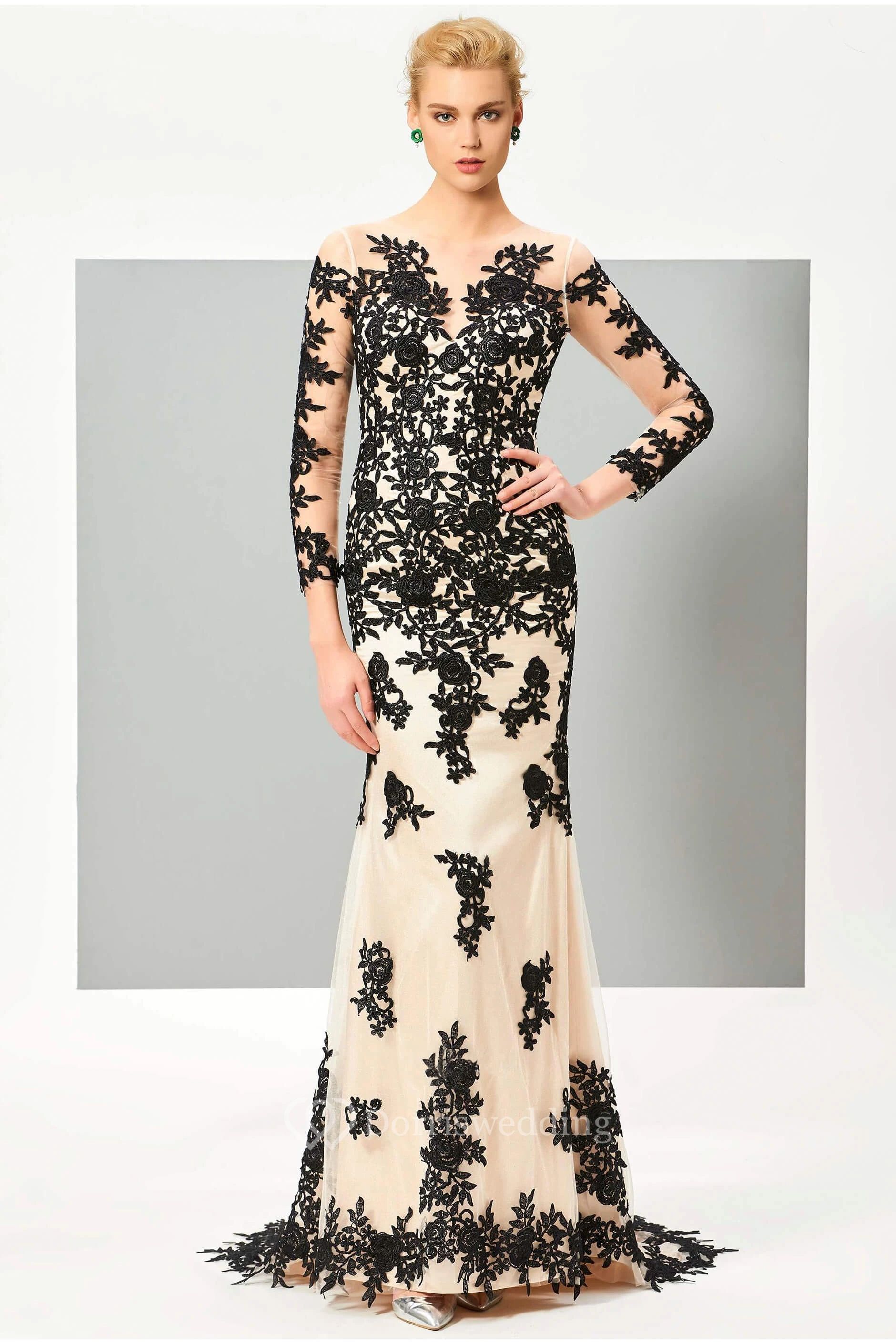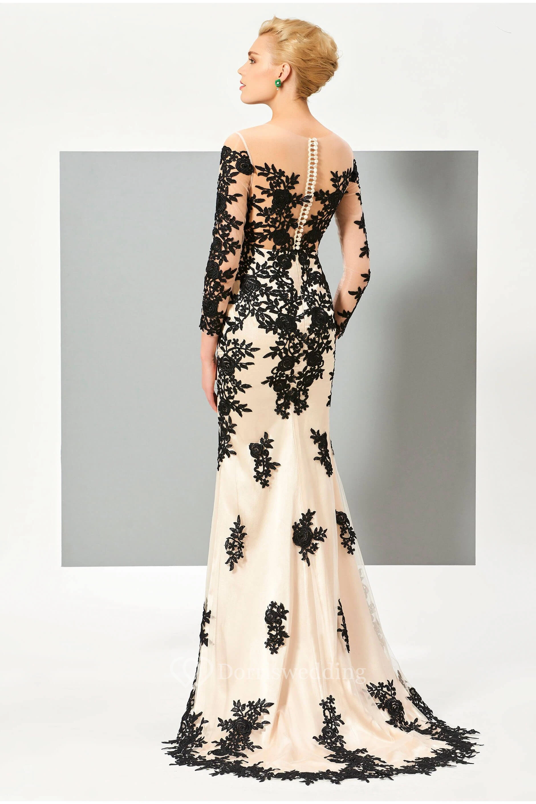 Floral Appliqued 3/4 Sleeve Illusion Two Tune Mermaid Gown With Button Back