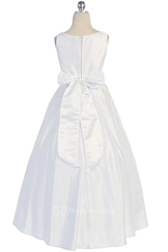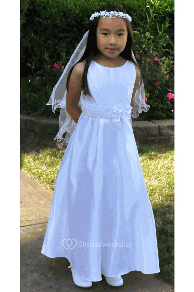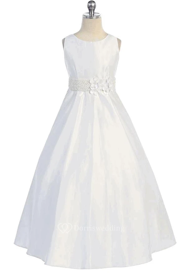 Floral Beaded Floral Satin Flower Girl Dress With Sash